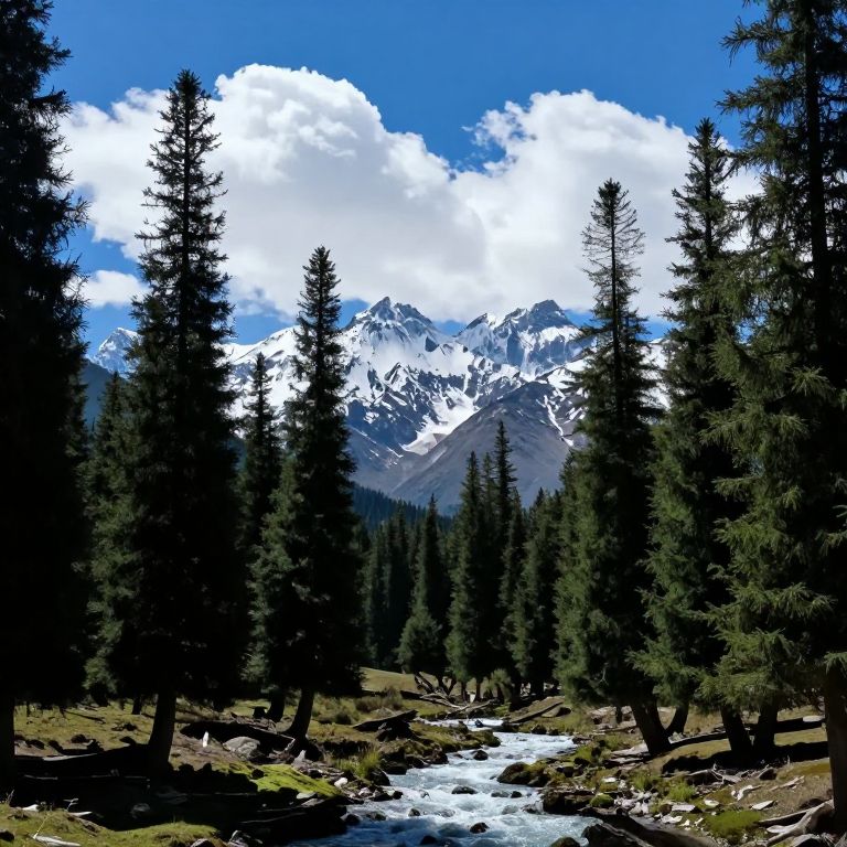 This is a digital photograph of a mountainous landscape. The image features tall, dark green pine trees on either side of a narrow, winding river that flows through a valley. Snow-capped peaks rise in the background under a bright blue sky with scattered, fluffy white clouds. The image has a high contrast with dark shadows and vivid, bright highlights.