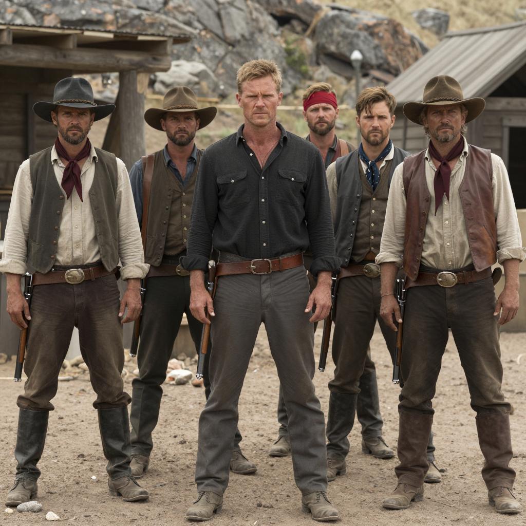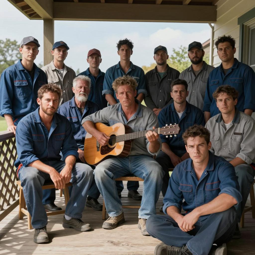 Group of 14 men sitting on a wooden porch, wearing blue and grey work clothes, some with hats. One man with an acoustic guitar, another with a serious expression in the foreground. Sunlight, clear blue sky, tree in background. Men's expressions range from serious to neutral. Porch has a latticed railing.