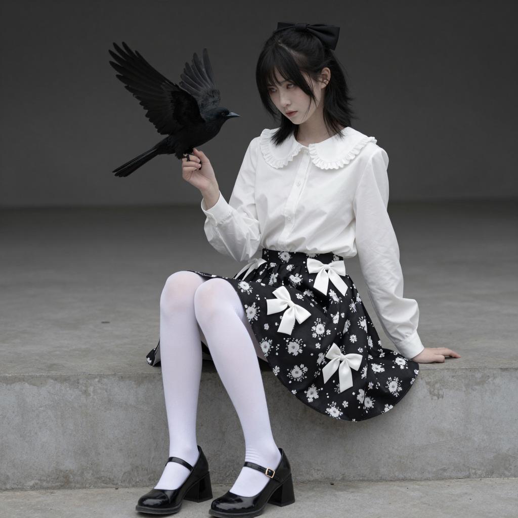 Young woman with pale skin and black hair in a bow, wearing a white blouse and black floral skirt with white bows. She holds a black bird in her right hand, sitting on a gray concrete ledge. White stockings, black Mary Jane shoes, intense expression. Dark, ured background.