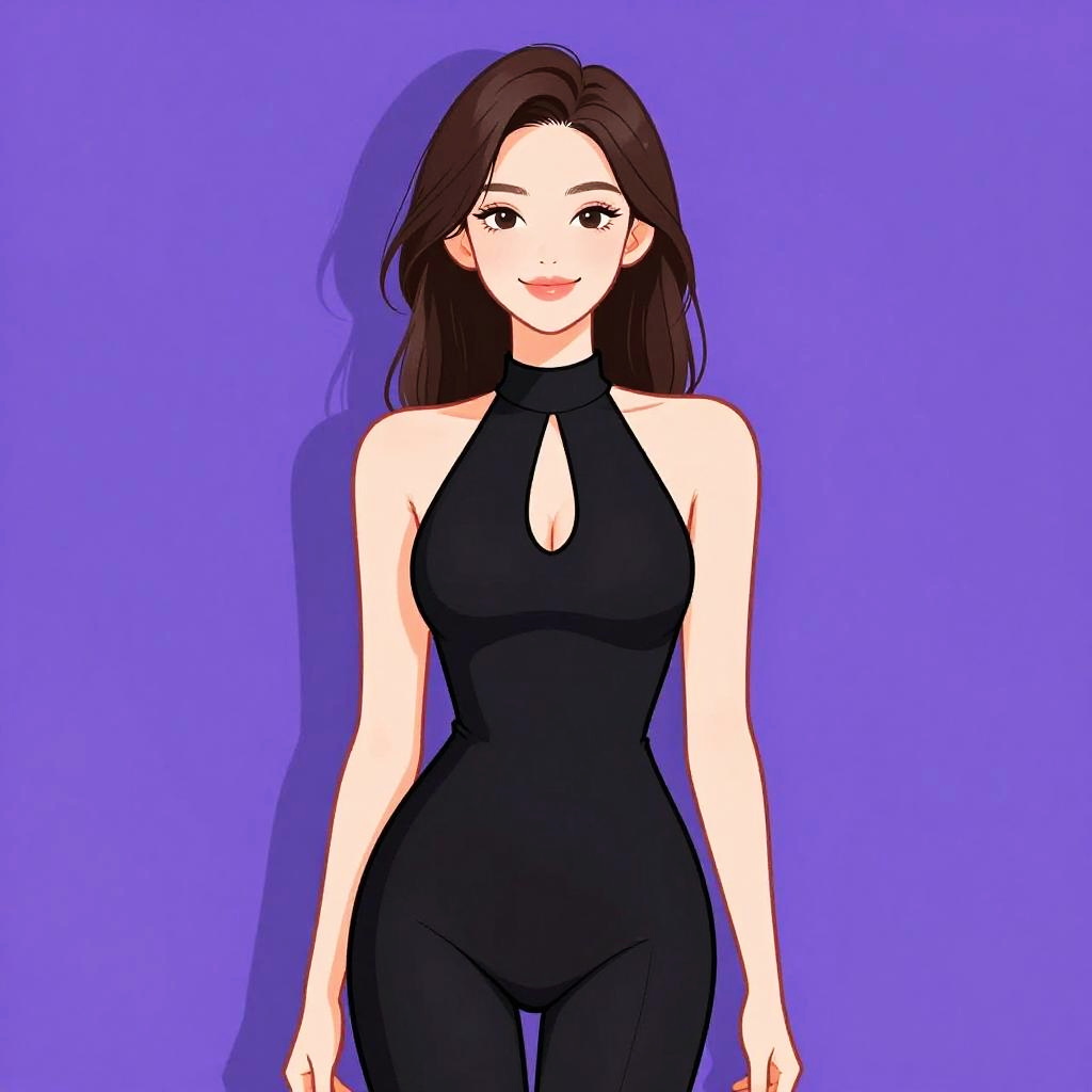 Illustration of a young woman with a soft blue short bob hairstyle wearing a fitted plaid midi dress with spaghetti straps. The dress features gray and brown tones with a slight flare towards the hem. She accessorizes with a delicate silver pendant necklace, standing against a solid purple background.