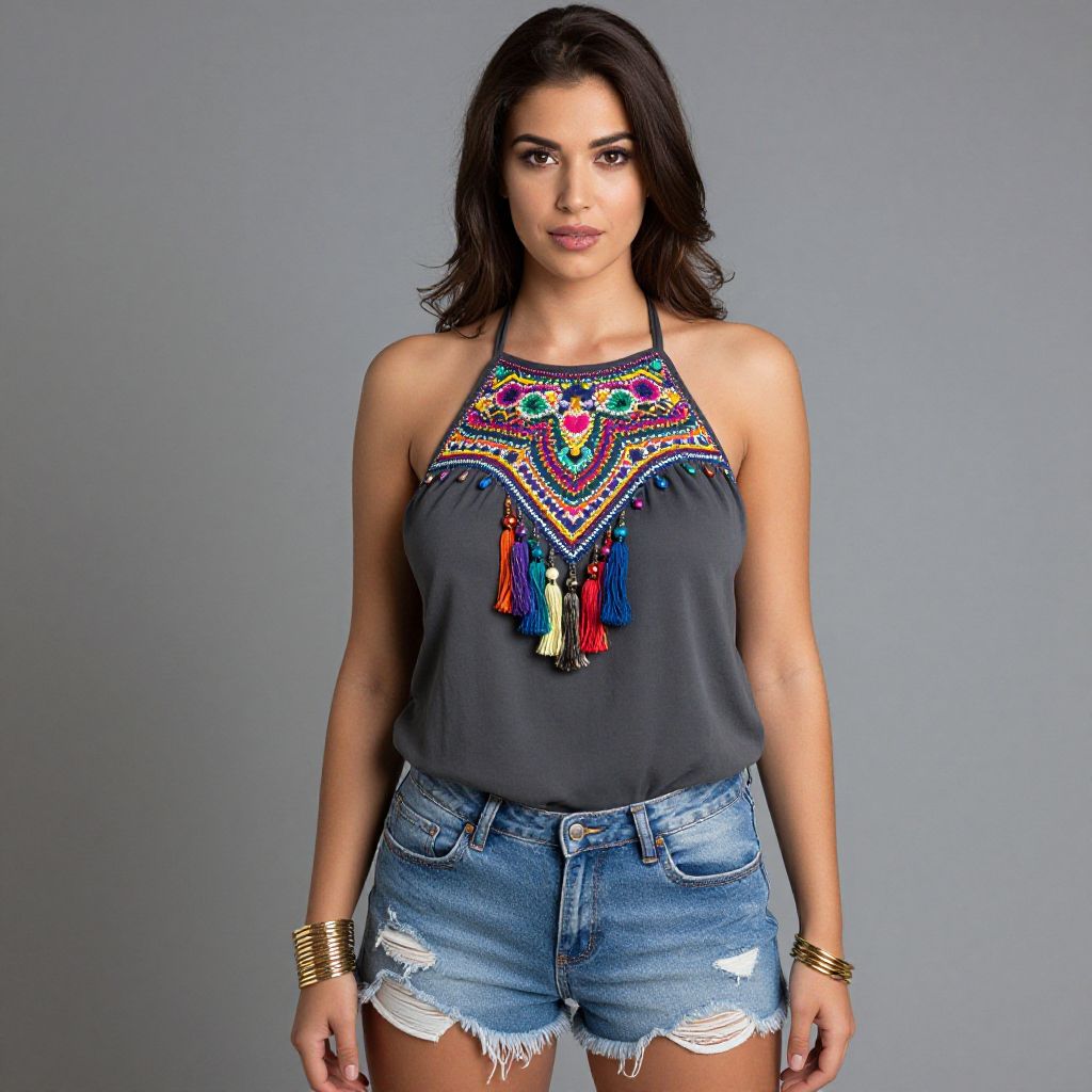 Photograph of a young woman with medium brown skin and dark brown, shoulder-length hair, standing against a plain gray background. She wears a dark gray, halter-neck top adorned with colorful, intricate embroidered patterns and tassels on the chest. She pairs the top with light blue, distressed denim shorts that have white frayed edges. Her accessories include multiple gold bangles on her right wrist. She has a neutral expression and is looking directly at the camera. The image emphasizes her casual, bohemian style and the vibrant, detailed embroidery on her top.