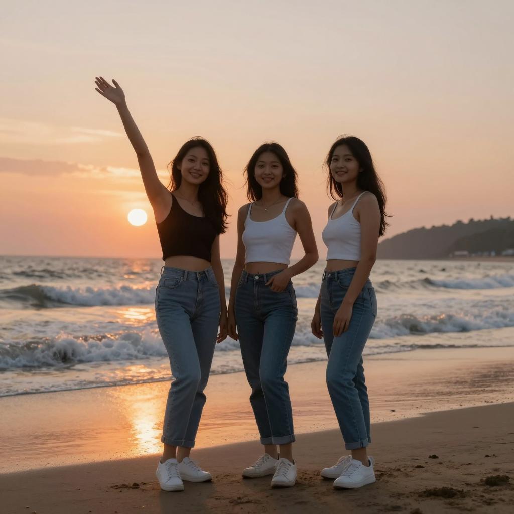 Two women in front of a Ferris wheel, both wearing fringe tops and high-waisted shorts, standing close, hands on each other's hips, legs touching, looking into each other's eyes. Both have long hair, sunglasses, and white face paint. Background: crowd, daytime, mountains, clear sky. Sunlight casts shadows on ground. Ferris wheel centered behind them, white with colorful lights. Both women have tanned skin, athletic builds, large breasts, and curvy figures. One woman has her knee raised. Crowd in background, some standing, some sitting.