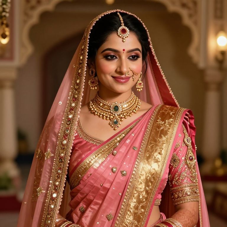 Photograph of an Indian bride in a pink and gold traditional saree, adorned with intricate jewelry, headpiece, and veil, smiling in a orn