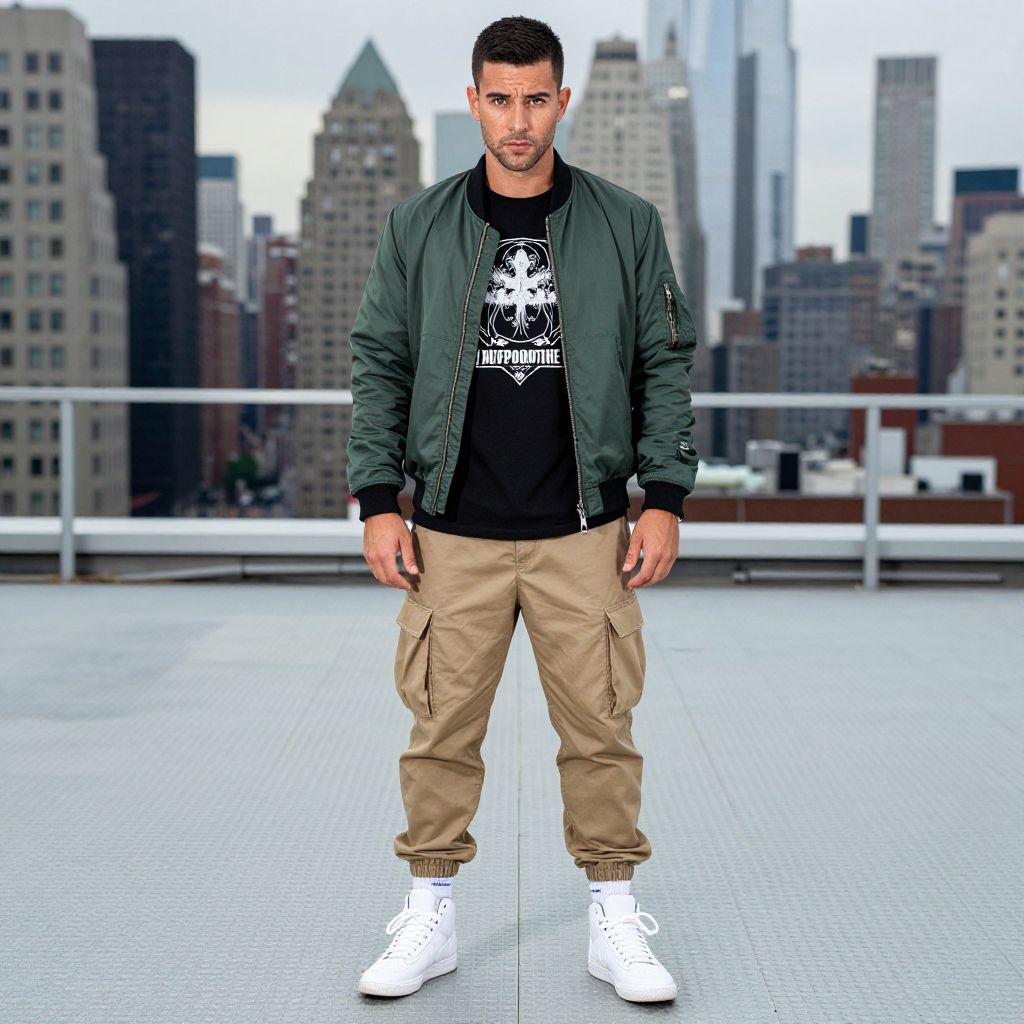 A man, cargo joggers in khaki, graphic tee in black, bomber jacket in forest green, high-top trainers in white, moisture-wicking sports socks, rooftop oasis, city skyline backdrop, sleek metal helipad, Cibachrome style, confident expression. Man has masculine face and piercing eyes