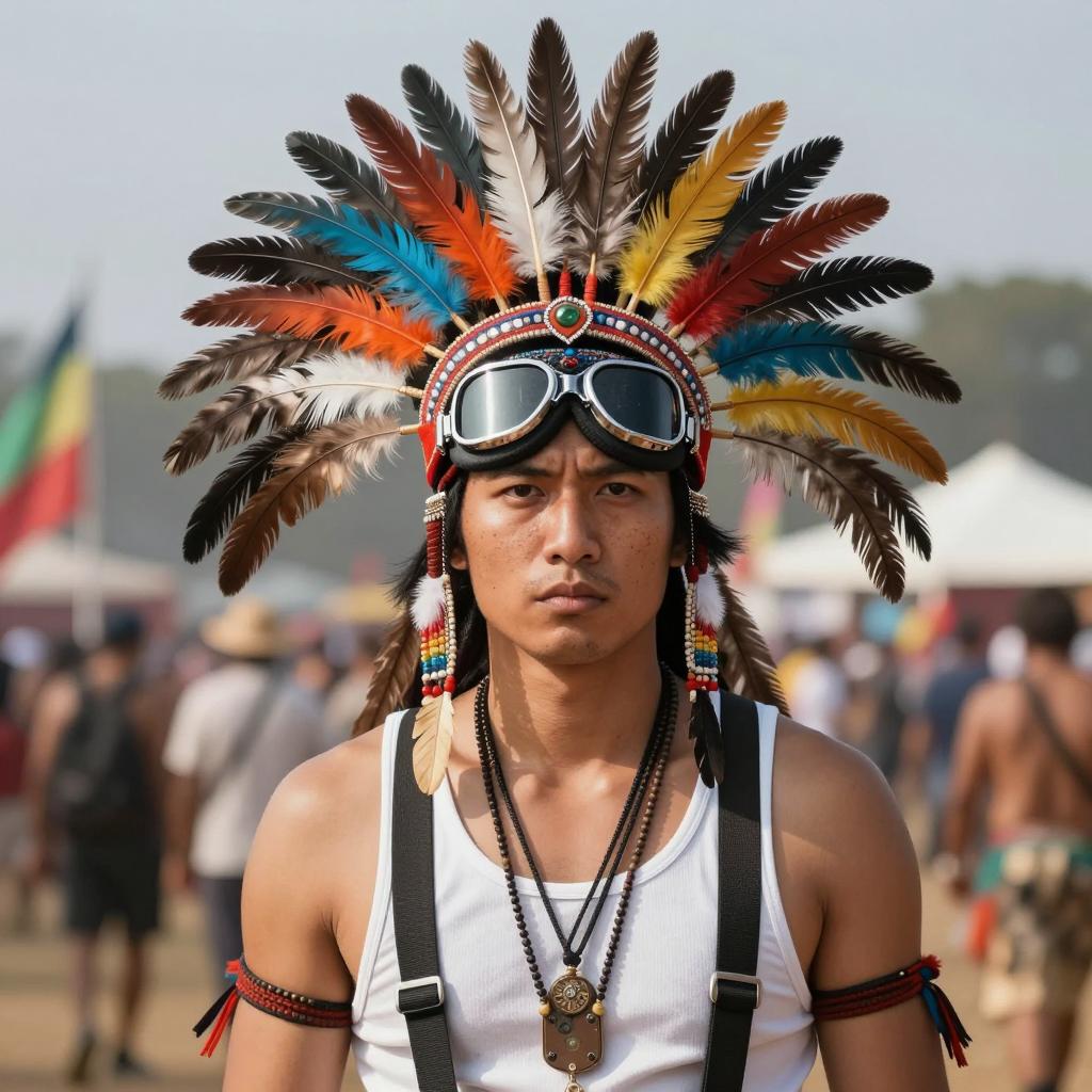Coachella costume male, photograph of a muscular man with long brown hair, wearing a colorful feather headdress, turquoise dress with red and blue stripes, multiple necklaces, and bracelets, standing in a sandy outdoor area, palm trees in the background, warm sunlight, daytime, traditional Native American attire, front view, serious expression, ethnic festival, detailed feathers, ethnic jewelry, sunny, vibrant colors