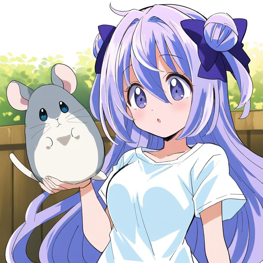 Amamiya shizuku (hizuki yayoi), original, 1girl, hair between eyes, blue eyes, purple eyes, purple hair, very long hair, blue hair, two side up, double bun, hair bow, medium breasts, collarbone, white shirt, blue bow, chinchilla (animal), animal, by artist hainchu, animagine