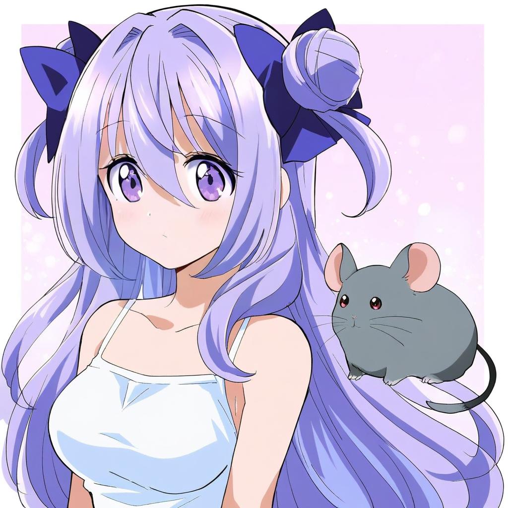 Digital anime-style portrait of a young girl with long purple hair styled in two side buns adorned with blue bows. She has large purple and blue eyes, a slight blush on her cheeks, and is wearing a loose white shirt. A cute gray chinchilla sits on her lap against a soft gradient background.