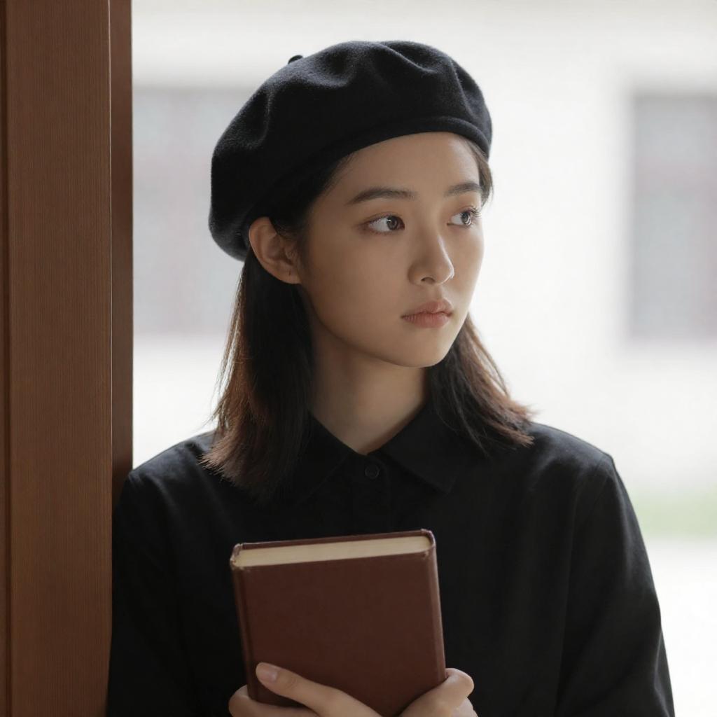 Photograph of a young woman with fair skin and dark hair in a black beret, wearing a black collared shirt, holding a brown book. She stands near a wooden door, with a blurred, brightly lit background. Her expression is thoughtful, with soft, natural light highlighting her face.