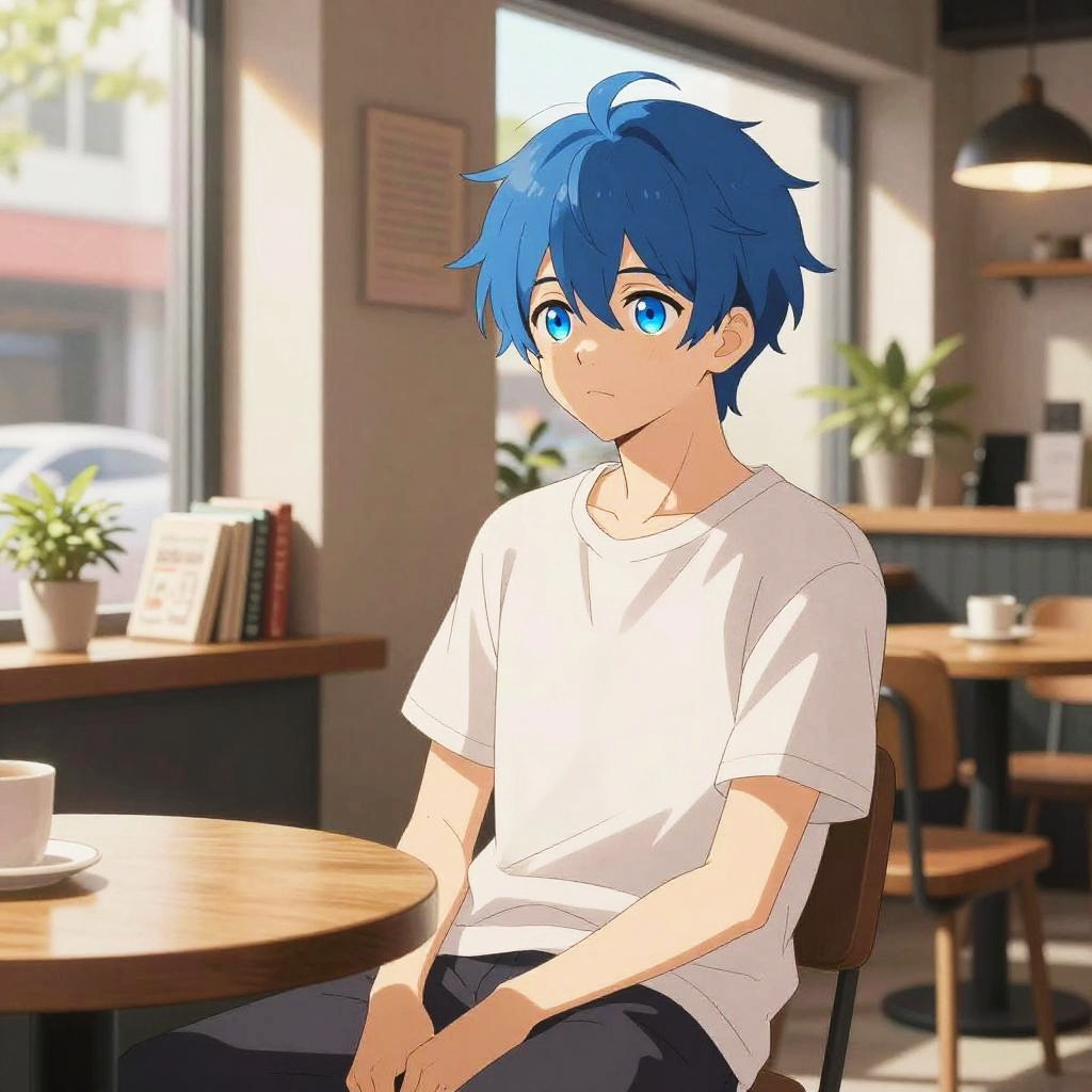 Anime boy with blue hair and blue eyes sitting casually in a cozy modern cafe, warm sunlight streaming through the windows, soft shadows, manga style with vibrant color palette, detailed background with books and plants, relaxed urban vibe.