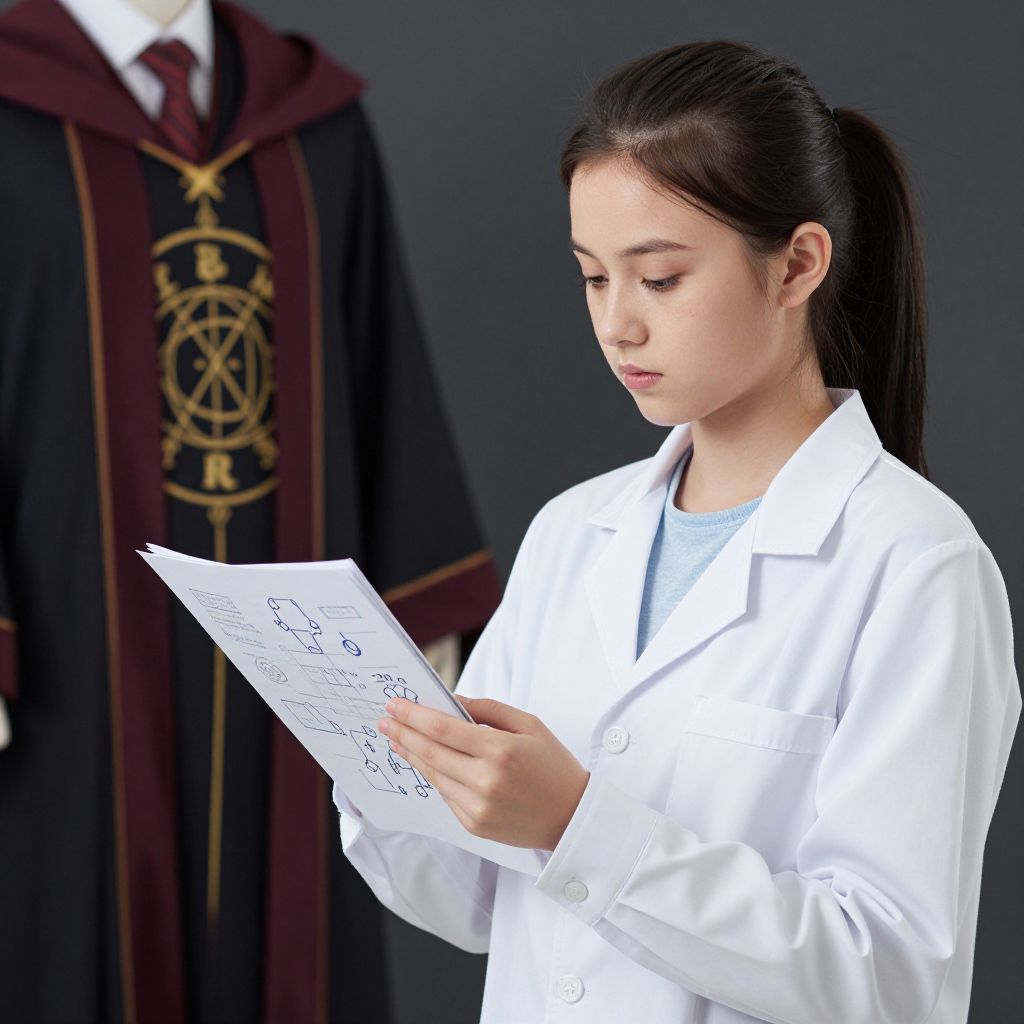 Photograph of a young Asian girl with fair skin and long black hair in a ponytail, wearing a white lab coat over a light blue shirt. She is intently reading a sheet of paper with handwritten notes. In the background, slightly blurred, is a dark maroon and black academic robe with gold trim and an intricate emblem. The background is a plain dark gray. The girl's expression is focused and calm, and she is positioned slightly to the right of the frame. The lighting is soft, highlighting the white of her lab coat and her focused gaze.