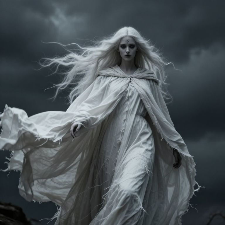 The image depicts a haunting figure, likely a banshee, characterized by long, flowing hair and a white or grey cloak that billows dramatically. The figure's face is pale and expressionless, with a crown-like symbol adorning the forehead, adding to the eerie atmosphere. The cloak is intricately detailed, with frayed edges and a textured surface that contrasts with the smooth, flowing hair. The background is a dark, stormy sky, enhancing the sense of foreboding and impending doom. The overall composition is dynamic, with the figure positioned centrally, drawing the viewer's eye immediately to the supernatural being. The interplay of light and shadow on the cloak and hair creates a sense of depth and movement, emphasizing the figure's ethereal quality.