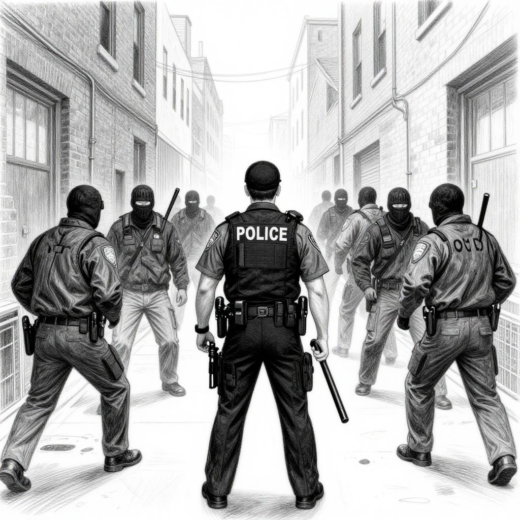 Black and white digital drawing of six police officers in tactical gear, facing away, standing in a narrow, urban alleyway with tall brick buildings on both sides. Each officer wears a helmet and has a gun holstered at their side. The word "POLICE" is prominently displayed on the back of the central officer. The officers are in a semi-circle formation, with their backs to the viewer, creating a sense of readiness and alertness. The alleyway's perspective narrows towards the background, emphasizing depth and tension. The image uses a high-contrast, sketch-like style with detailed line work.