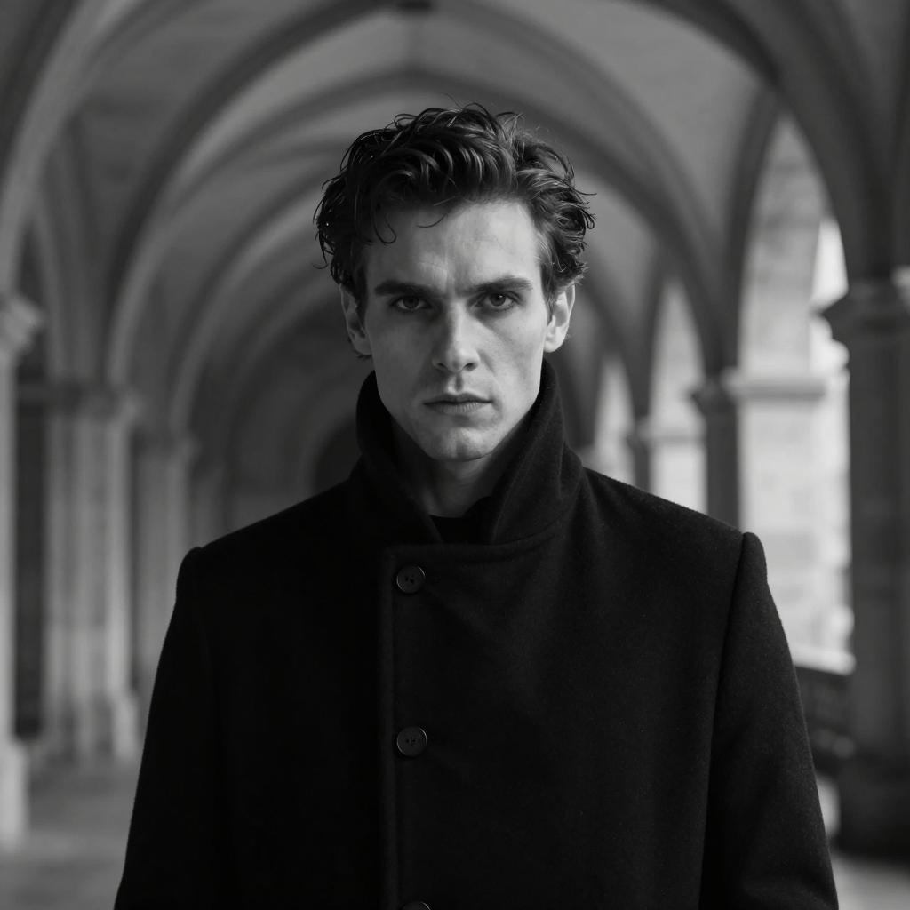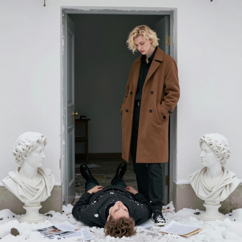 Black and white photograph. Man with short dark hair, wearing dark coat and pants, sits on large metallic wing. Wing's hand is raised, covering part of his face. Close-up of winged figure's face in background. Wing and figure are metallic with smooth ures. Man's expression is neutral, slightly concerned. Two people. Winged figure's face is serene. Wing extends from left, partially covering man.