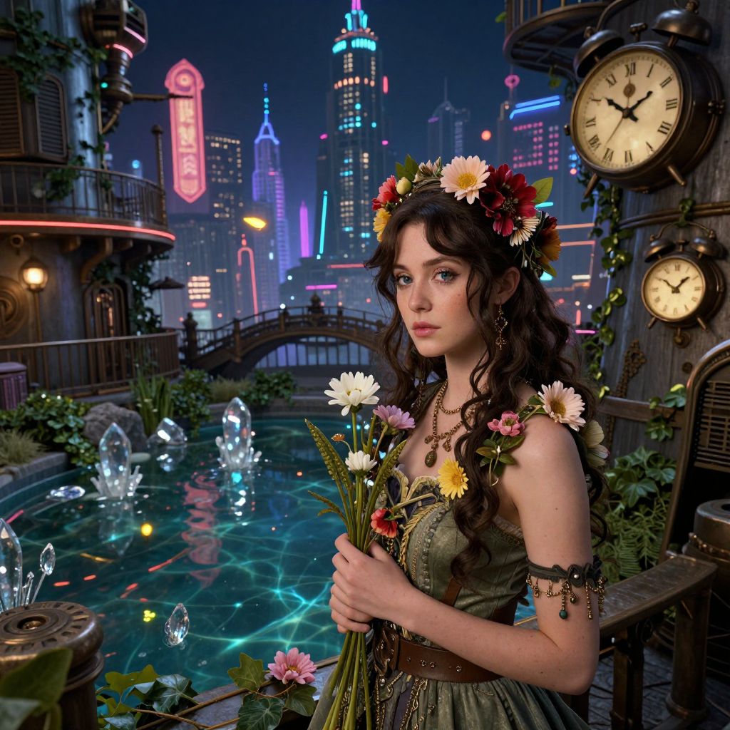 A detailed, cinematic, neon cityscape featuring a young woman adorned with flowers, set against a steampunk backdrop with a crystal clear pond, ivy, and a firefly, all under atmospheric lighting and a stop clock.