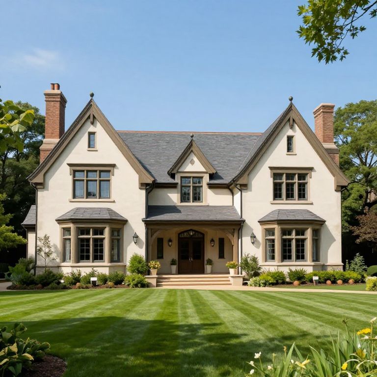 Stately 1920s Tudor estate showcasing luxurious architecture with two prominent chimneys, multiple gabled windows, and a grand entrance framed by wooden beams, surrounded by meticulously manicured lawns and lush greenery under a clear blue sky.