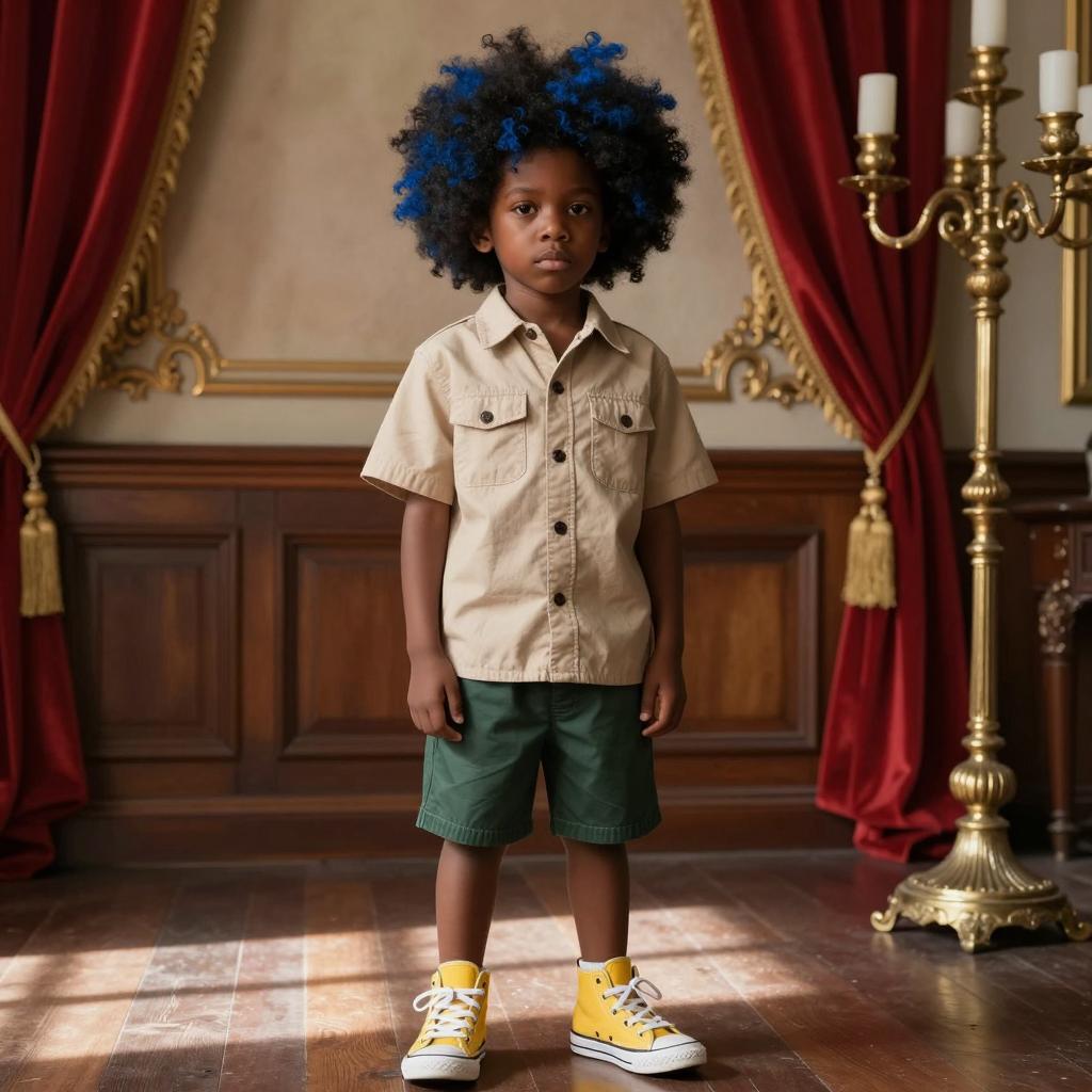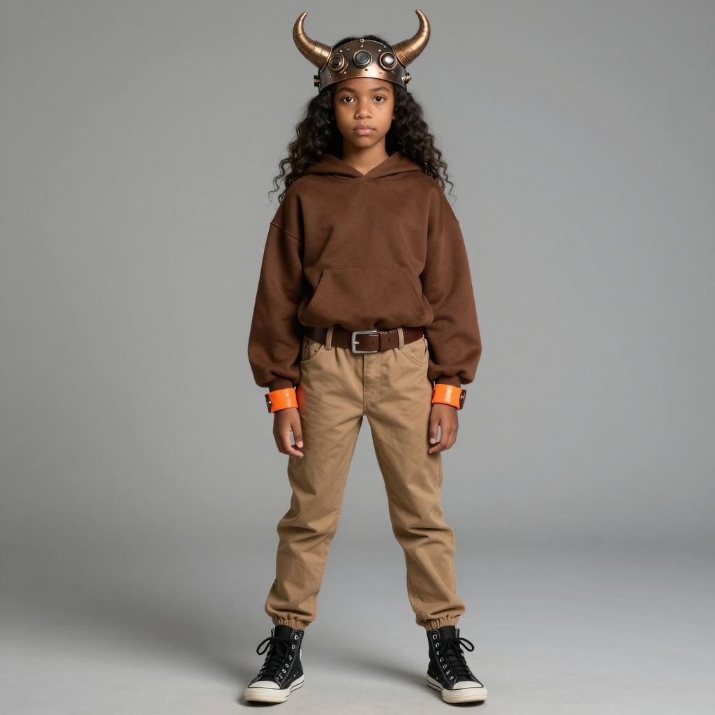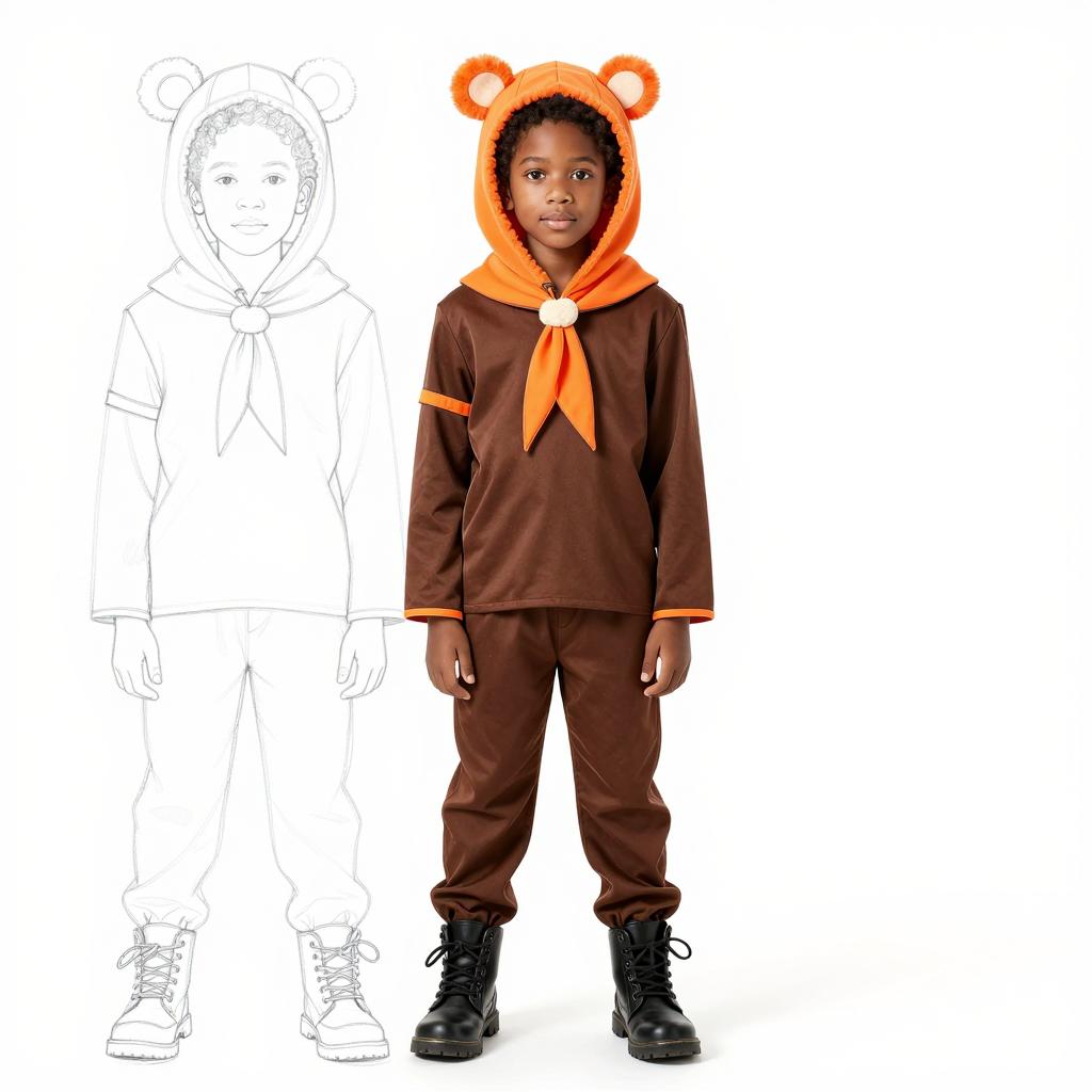 Photograph of a young black boy wearing a brown boy scout-style outfit with orange trim on sleeves and collar. He has a cute orange bear hood with ears and is wearing black boots. The boy stands against a plain white background with a neutral expression and casual stance. The image is well-lit with high contrast and daylight, showcasing a full body shot in a realistic style.