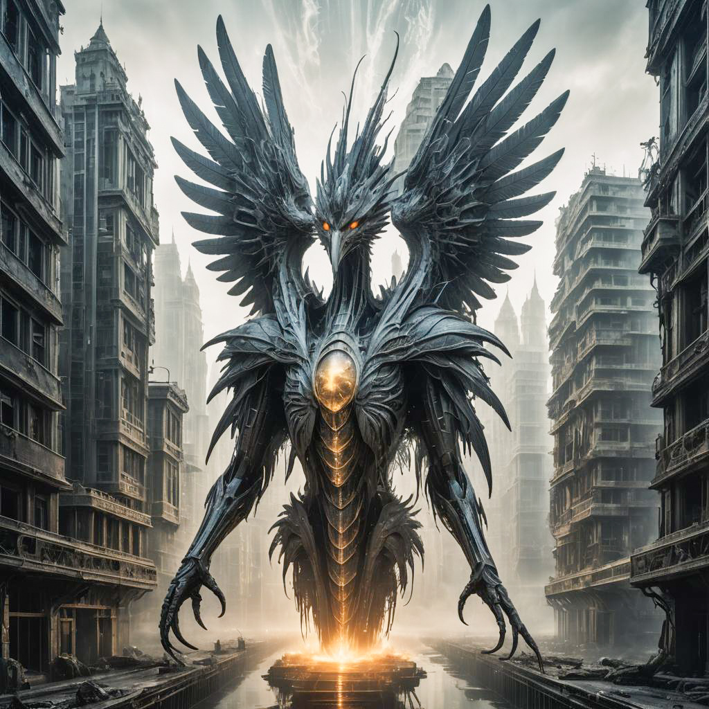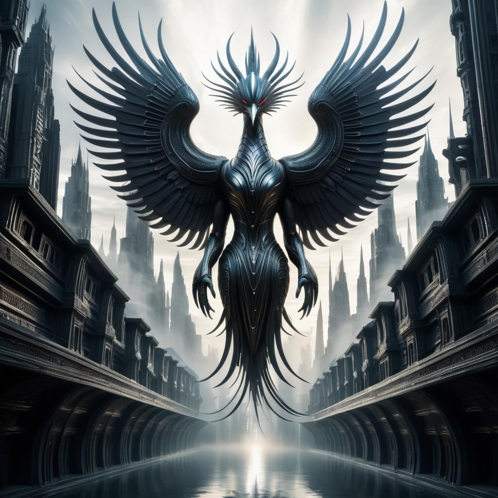 Hybrid creature in H.R. Giger style, depicting ethereal phoenix within a floating metropolis