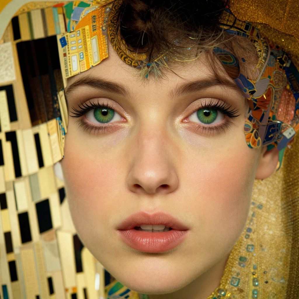 A photorealistic portrait in surrealism showcases a woman with captivating green eyes, her expression a mixture of curiosity and caution as she is surrounded by an intricate web of metallic patterns that appear to emanate from her own aura. Her refined features contrast against this backdrop of technological intricacies, creating a scene where the natural elegance of human beauty intertwines with the sterile precision of machinery. This evocative image captures a harmonious blend of science fiction and mysticism, reminiscent of an iconic style without direct references to specific artists like Dali or Giger.