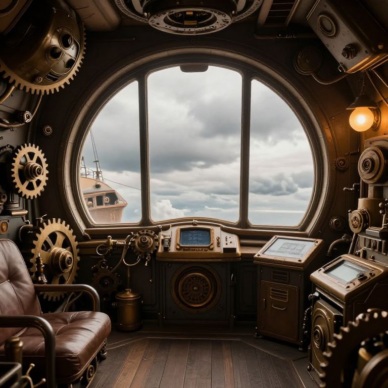 A digital illustration of a steampunk-style ship's cockpit features a large circular window showing a cloudy sky and a distant ship. The interior is dark, with brown leather chairs and multiple brass gears and cogs. Control panels with dials and buttons are on the right and center, and a small lamp illuminates the right side. The wood-paneled floor and intricate mechanical details evoke a vintage, industrial aesthetic. The overall color palette includes browns, bronzes, and muted metallics, with soft lighting enhancing the atmospheric, nostalgic feel.