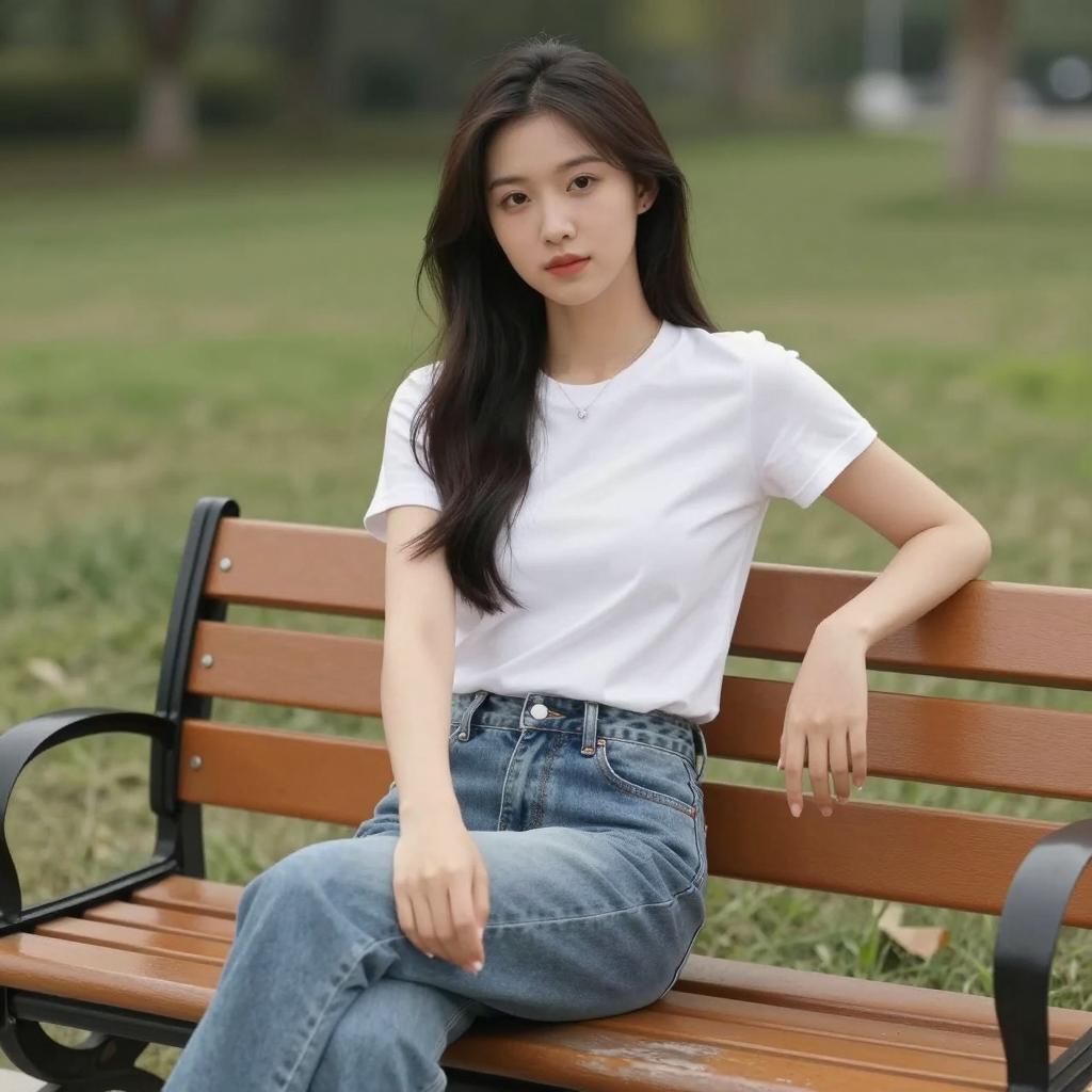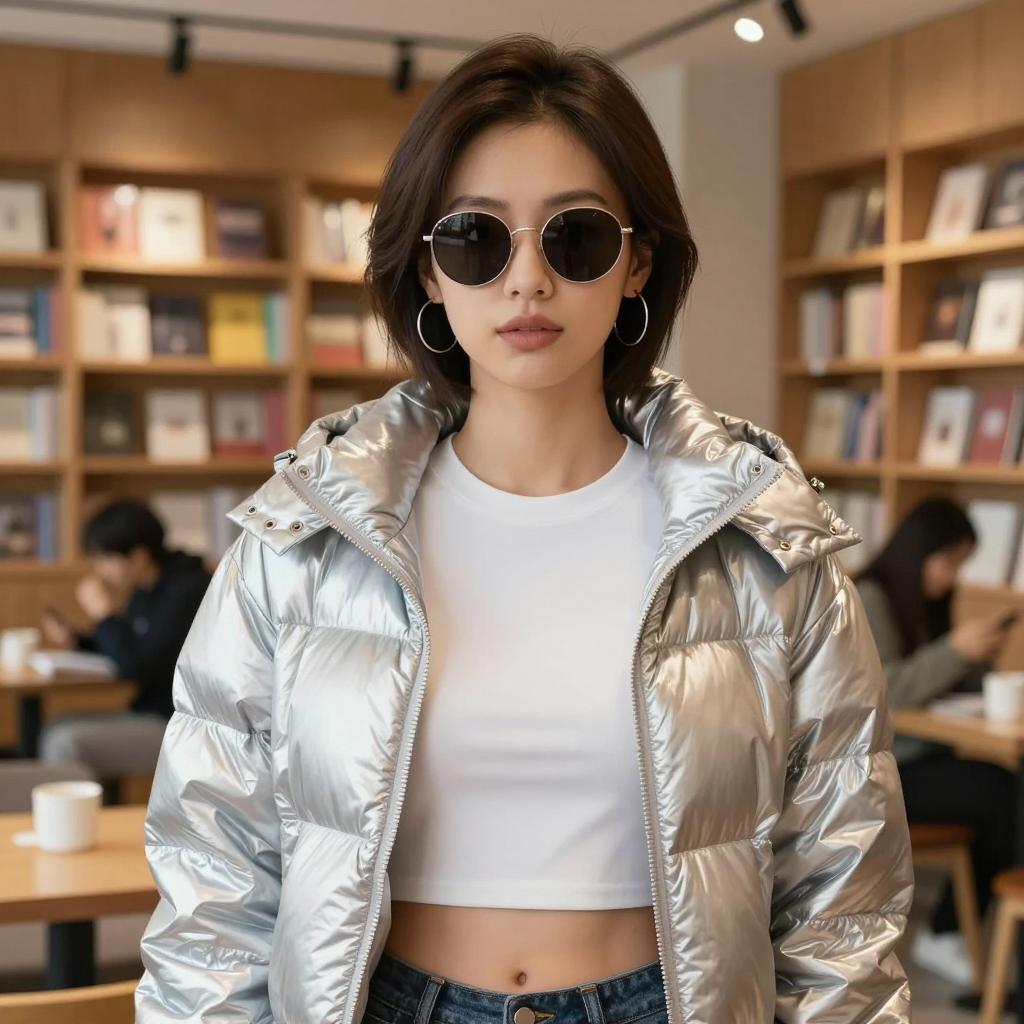 Portrait of a young woman with long brown hair wearing a light grey hoodie and white denim shorts. She is standing outdoors near a modern building entrance with glass doors and railings. The natural soft light illuminates her face and hair, creating a warm, relaxed atmosphere in a casual fashion style.