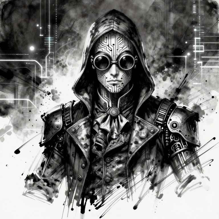 InkPunk art portrait of a mysterious hacker with ink-drawn circuitry patterns on their skin, wearing goggles and Victorian era inspired attire fused with robotic enhancements, dynamic ink strokes and glowing data streams in the background.