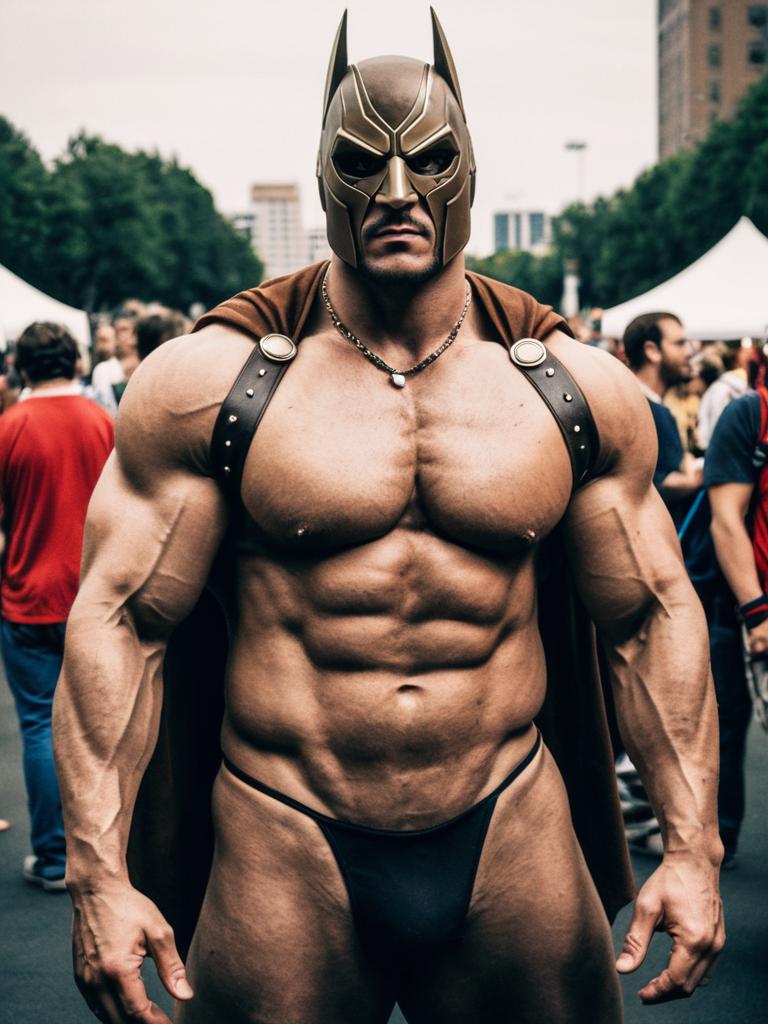 Photorealistic portrait of a muscular man wearing a buff male superhero costume including a stylized mask, leather straps, cape, and minimal black briefs at a cosplay festival. The man is standing outdoors with blurred festival attendees and urban buildings in the background.