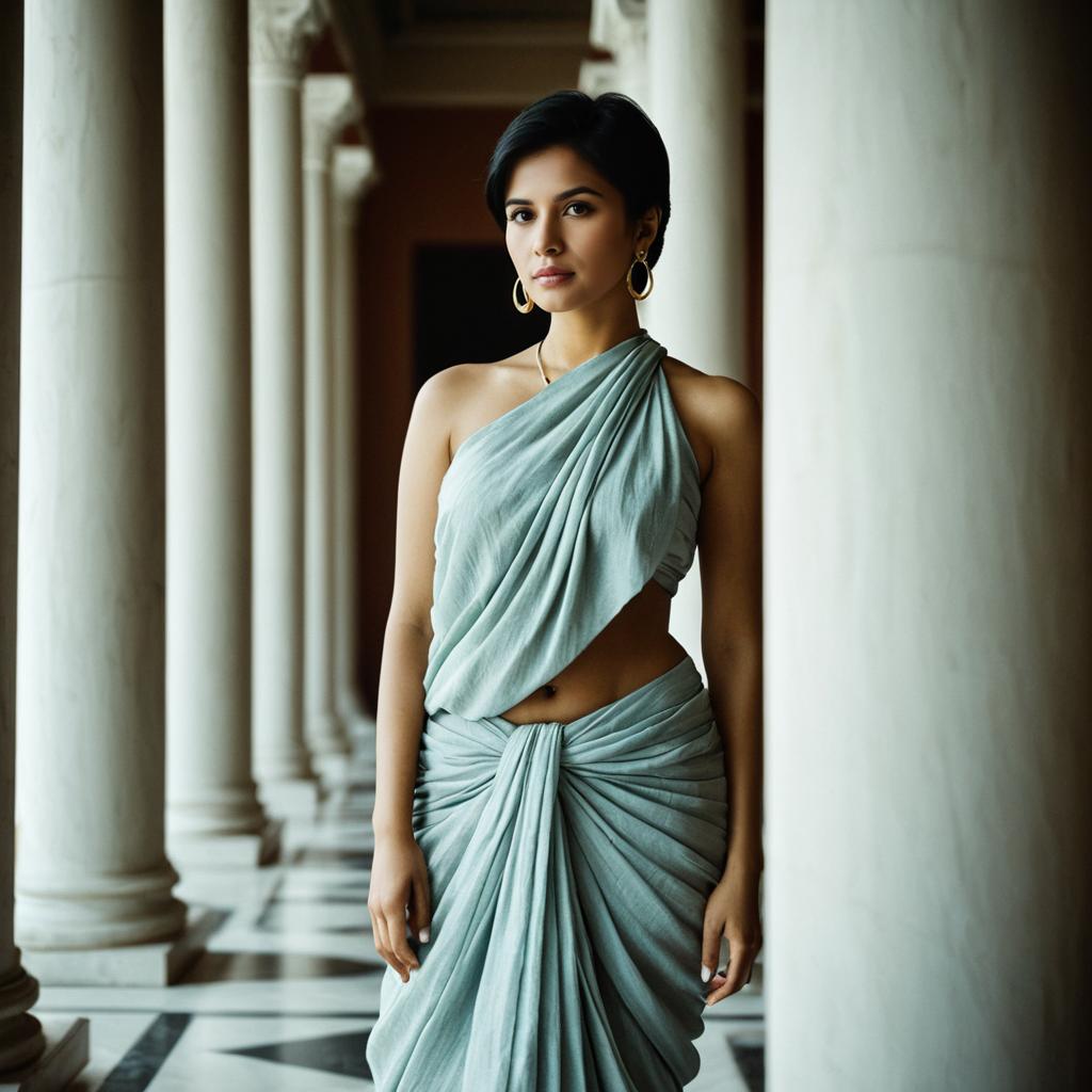 Dhoti dress woman,1girl, solo, black hair, earrings, jewelry, realistic, short hair, pillar, fine art parody, looking at viewer, column, hoop earrings, standing, blurry