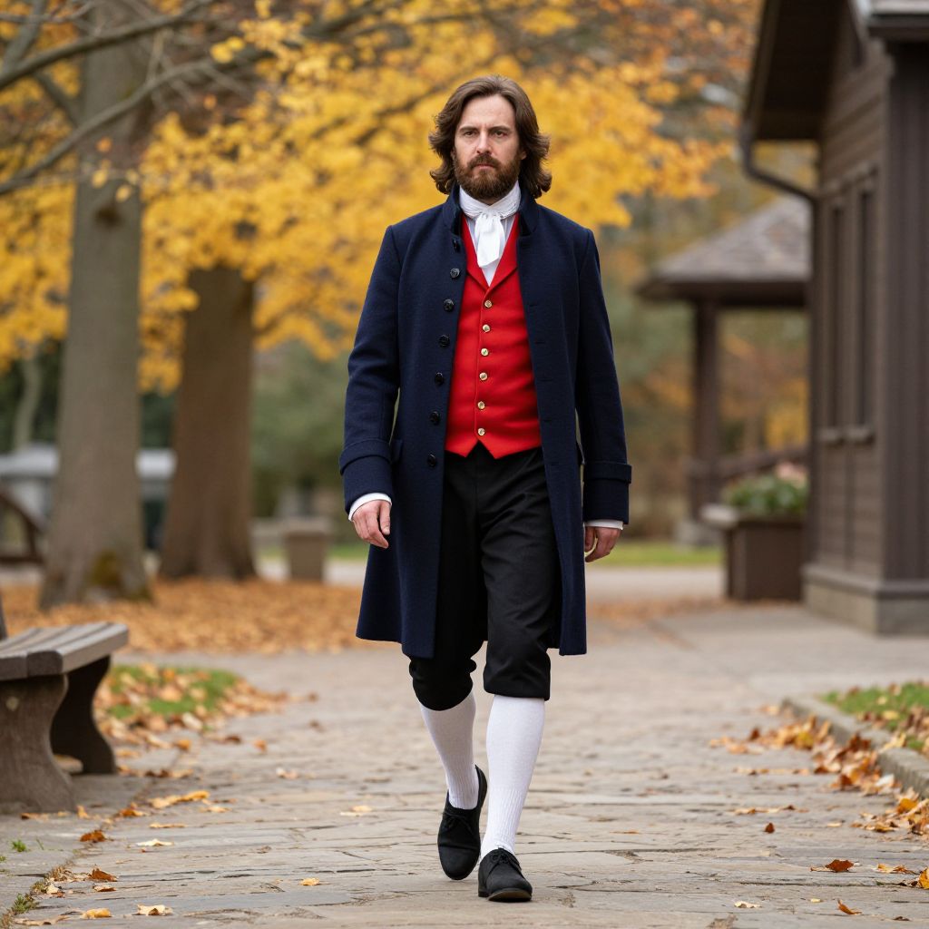 A photograph of a bearded man with shoulder-length brown hair, walking down a stone path in an autumnal setting. He's dressed in an 18th-century style outfit, including a navy blue coat, red waistcoat, white shirt, black breeches, white knee socks, and black shoes. The background features yellow-leaved trees and a wooden building. The path is scattered with fallen leaves, and there's a wooden bench to the left.