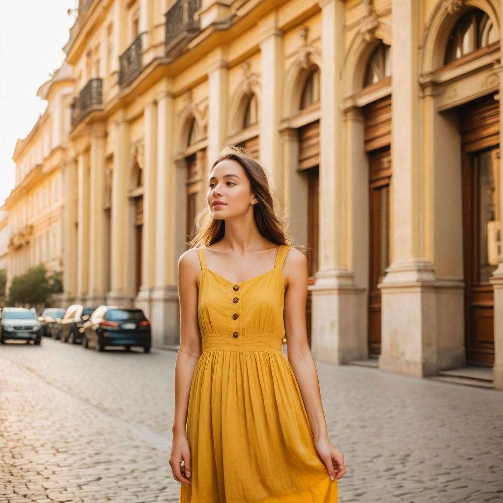 A young woman standing on an urban street in bright and cheerful, dressed in a flowy yellow sundress, natural warm lighting, background showing classic European architecture in brown and beige color, subtle emotional expression, late afternoon atmosphere