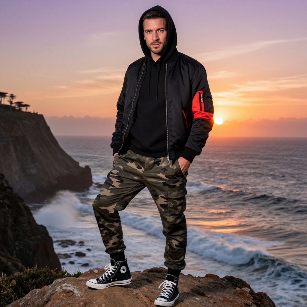 "a man, fitted black hoodie, camo print joggers, high-top canvas sneakers, bomber jacket, bold color accents, coastal cliffside, crashing waves below, vibrant sunset glow, dynamic pose with one hand in pocket, confident smile.Man has masculine face and piercing eyes"