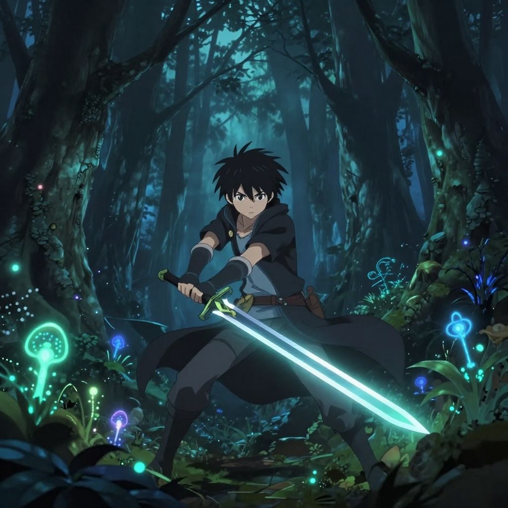 Dark forest anime setting, enchanted woods filled with bioluminescent plants, mysterious shadows, a determined anime hero wielding a glowing sword, detailed atmospheric effects