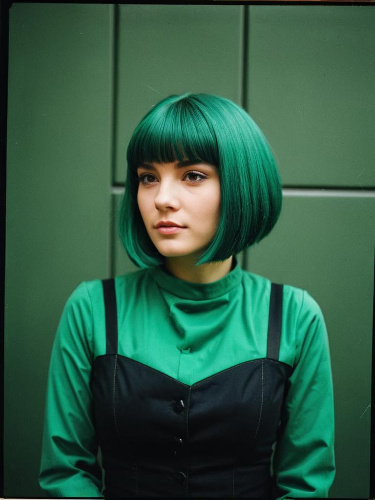 Woman in Emerald Green Bob Hairstyle costume, cosplay editorial portrait, cinematic realism