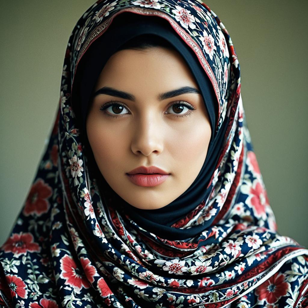 Islamic outfit ladies,1girl, solo, looking at viewer, upper body, blurry, floral print, blurry background, lips, realistic