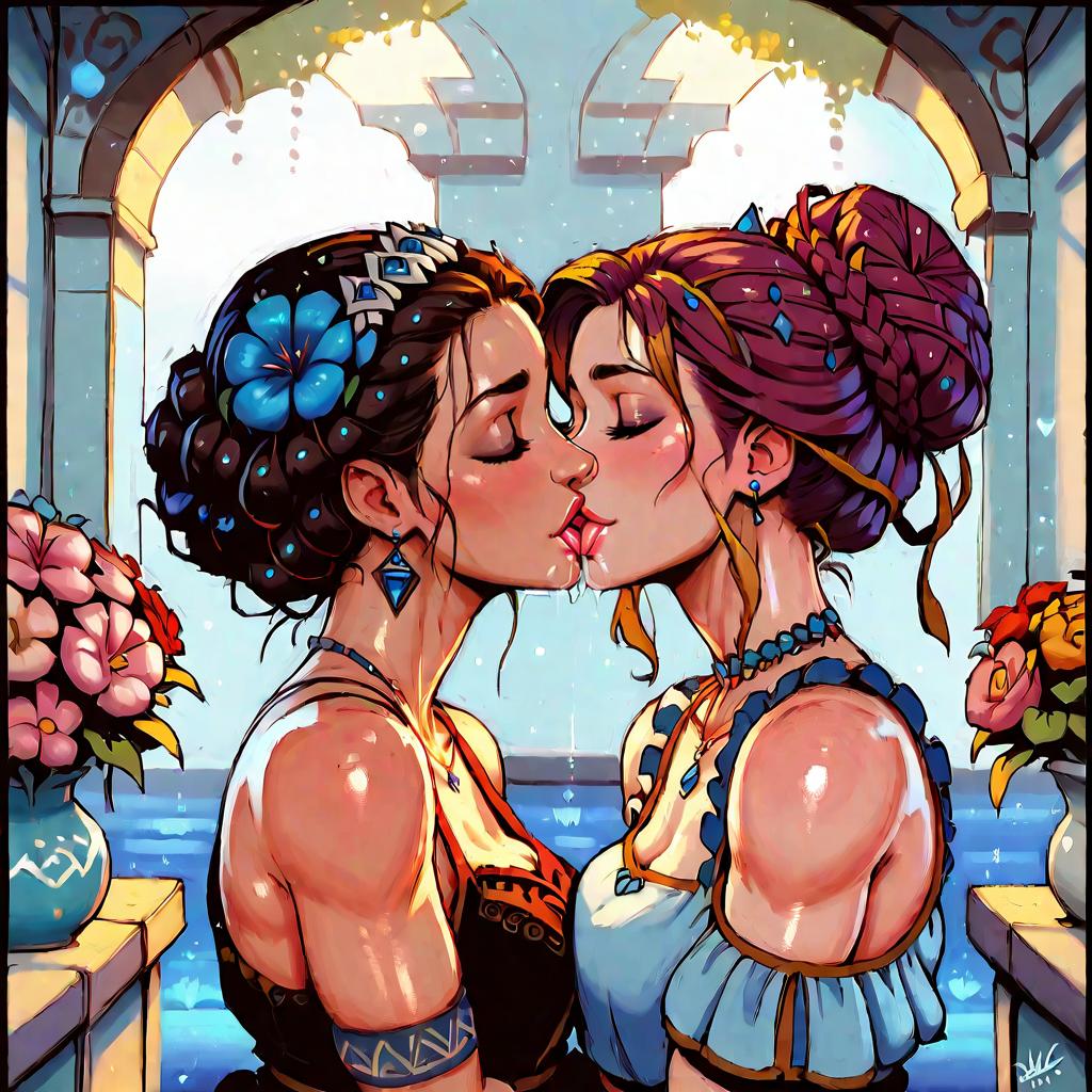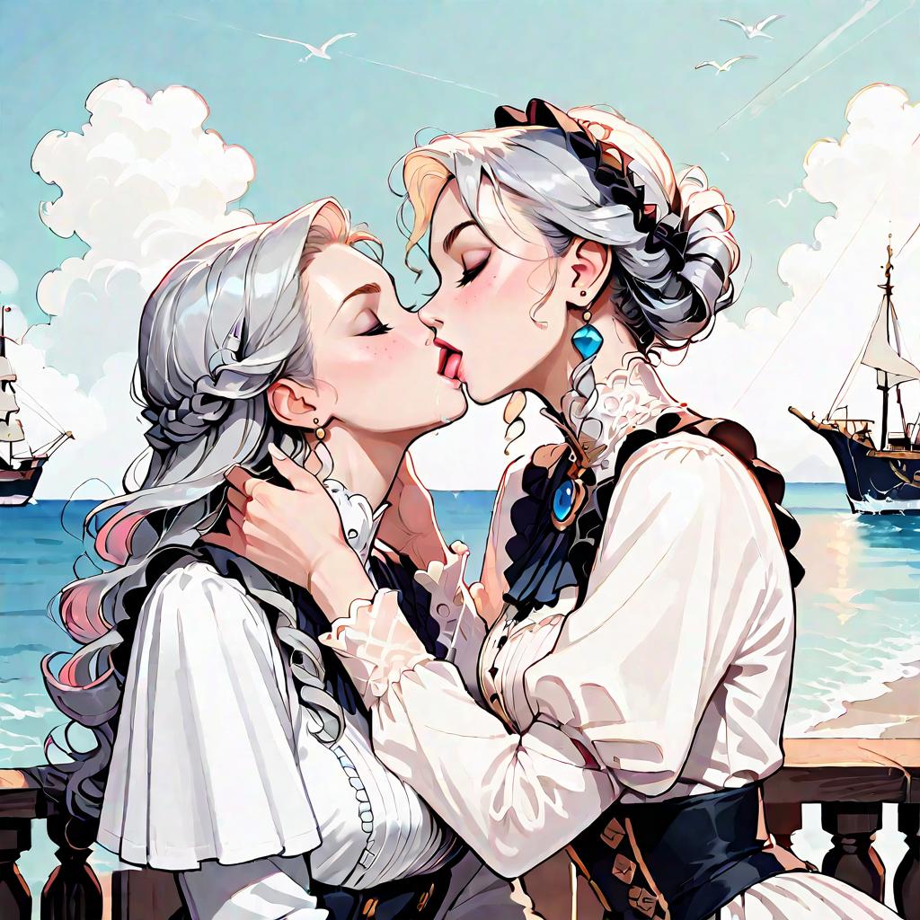 Score_9, score_8_up, score_7_up, 2girls, kissing, silver hair, 35mm Vintage photo of queens standing on a sailship, victorian, long hair, curly hair, ornate white uniform, white fur, ocean, at sea, sailing