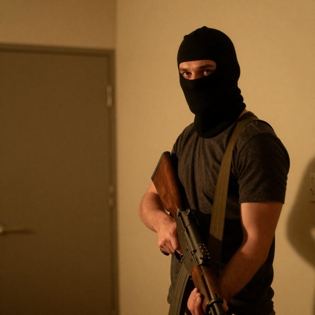 Photograph of a serious young man in a black balaclava, holding a rifle, standing in a dimly lit room with warm, yellow-orange lighting. He is positioned to the right, with a door and wall in the background. The image has a cinematic, dramatic feel.