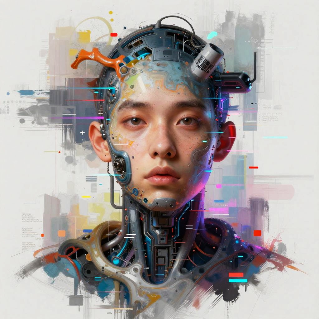 Custom AI art generator visualizing an abstract portrait combining human features with machine elements, vibrant glitch effects, digital brush strokes, futuristic neon highlights, a fusion of organic and synthetic aesthetics, concept art style.