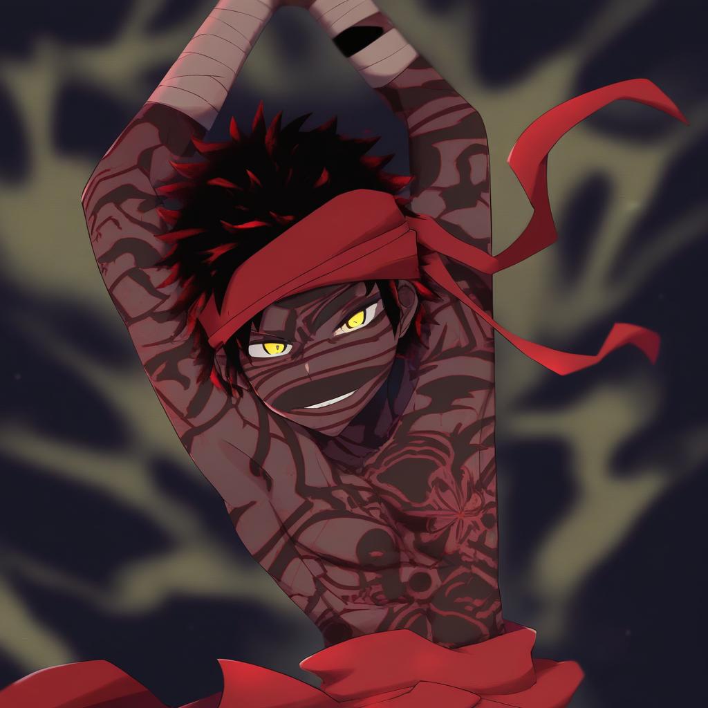 Anime-style illustration of a dark-skinned male character with black, spiked hair and glowing yellow eyes. He is topless, featuring full-body tribal tattoos and wrapped bandages on his forearms. The character wears a flowing red headband and matching sash around his waist, set against a dark, abstract background.