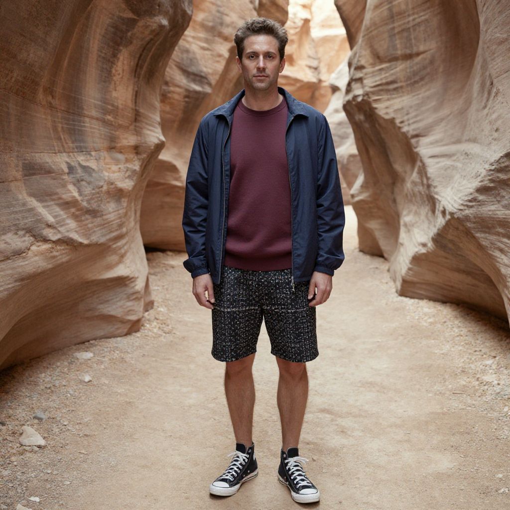 A man, eco-friendly chambray blazer, light beige hemp shorts, white organic cotton t-shirt, brown leather sandals, historic brick building, large wooden doors, vintage luggage carts outside, cri film style, relaxed expression. Man has masculine face and piercing eyes