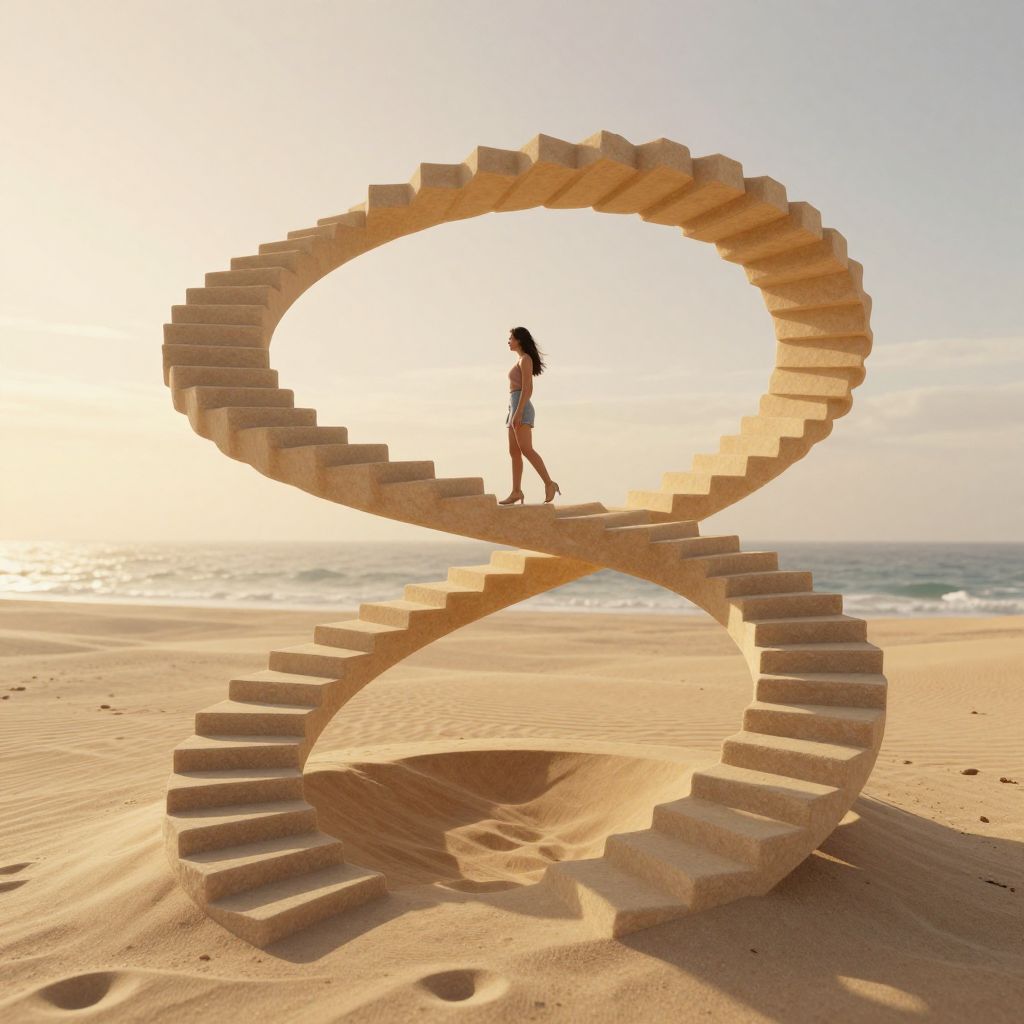A surreal 3D-rendered scene depicts a woman standing on a curving staircase that defies gravity, seamlessly looping into itself against a vast, dreamlike backdrop of sand and sea, evoking a Möbius reality loop with ethereal golden-hour lighting.