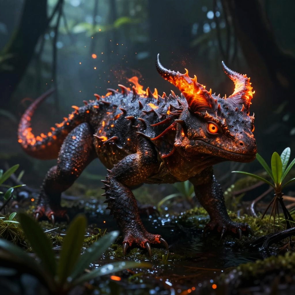 Ember-lizard creature with ember-lit horns and coarse dark skin, prowling stealthily with embers drifting off its back, dense mangrove swamp at night with phosphorescent plants, action shot, skin pores, very dark lighting, heavy shadows, detailed face, vibrant, photorealistic, dramatic, sharp focus, 8k, (intricate:1.4), decadent, (highly detailed:1.4), digital painting, concept art, octane render, artstation, smooth illustration, global illumination, studio light, volumetric light, atmospheric fog, particles floating, embers, wet surfaces, rim light, depth of field