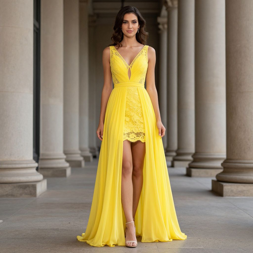 Radiant woman wearing a vibrant yellow v-neck lace short prom dress with a sheer bodice and flowing chiffon skirt, standing gracefully in front of a classical colonnade with tall stone columns.