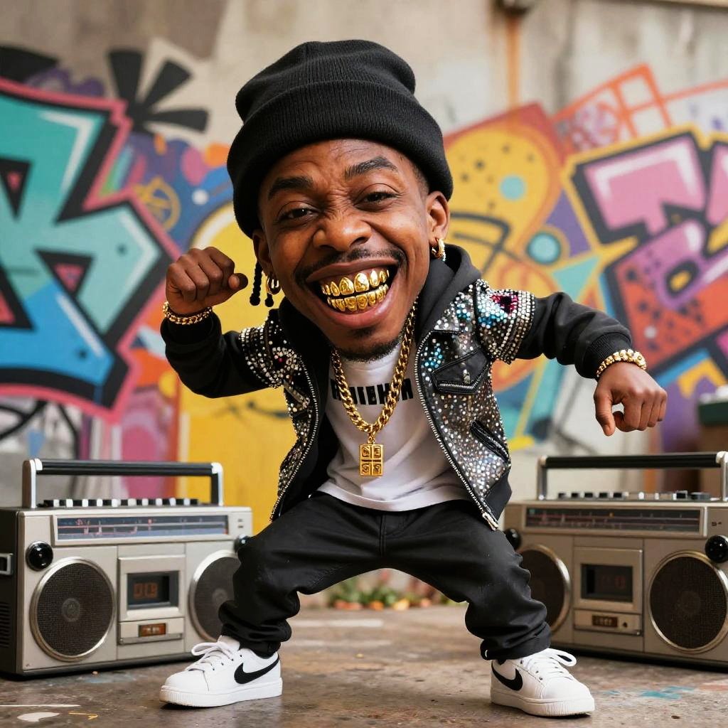 Rapper caricature in action pose, exaggerated mouth and eyes, flashy outfit with gold teeth, boom box nearby, abstract street art elements blending into background, vibrant color scheme, youthful and edgy style, celebrating hip hop culture with humor