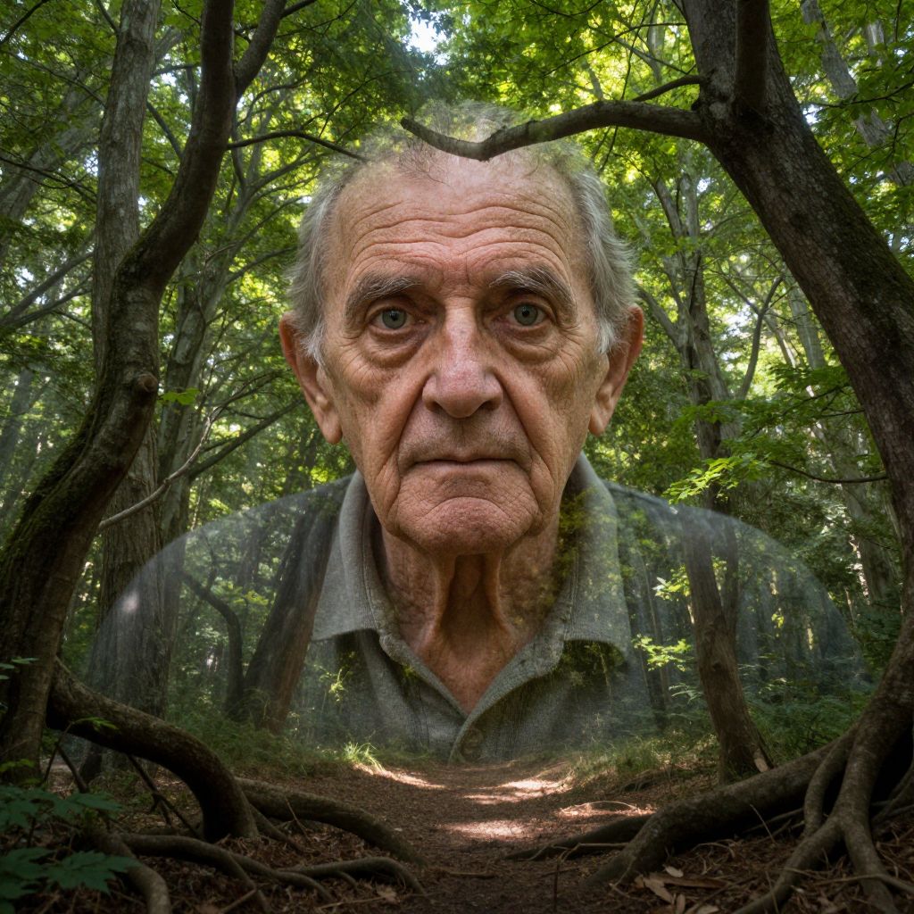 Photograph of an elderly man with wrinkled skin, grey hair, and intense expression, superimposed into a dense, sunlit forest.