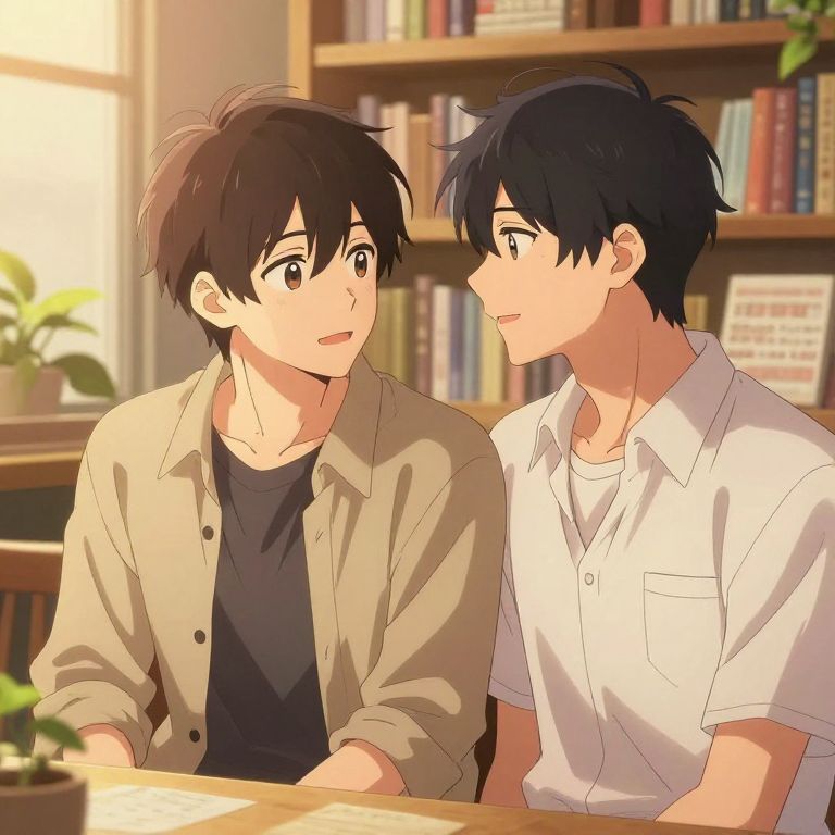 Anime-style drawing of two young men with short black hair, smiling at each other in a sunlit bookstore, wearing casual shirts.