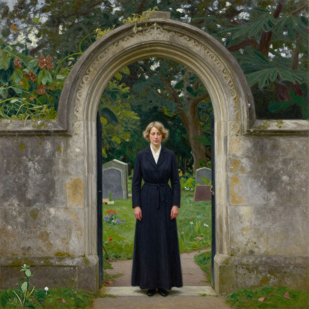 Woman standing solemnly within an ornate stone archway at Highgate Cemetery, framed by lush greenery and a tranquil garden setting, as depicted in an oil painting by Mike Hawthorne in 1986.