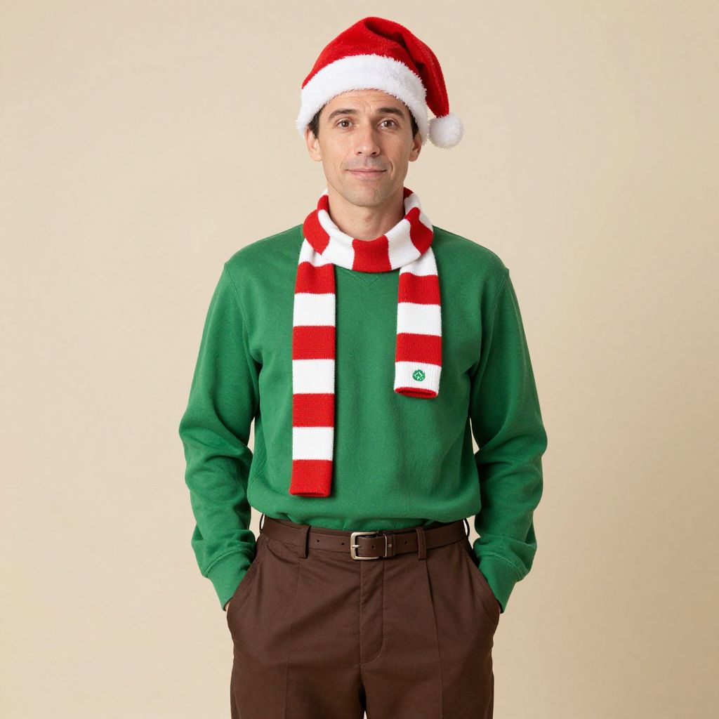 Man wearing a green shirt and brown pants with a red and white striped scarf around his neck. He is standing with his hands in his pockets and is wearing a Santa hat on his head.