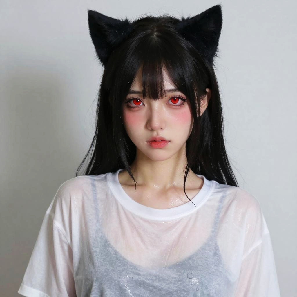 3dmm style, realistic, 1girl, black hair, red eyes, slit eyes, glowing eyes, oversized shirt, parted lips, blush, cat ears, wet shirt, sweaty