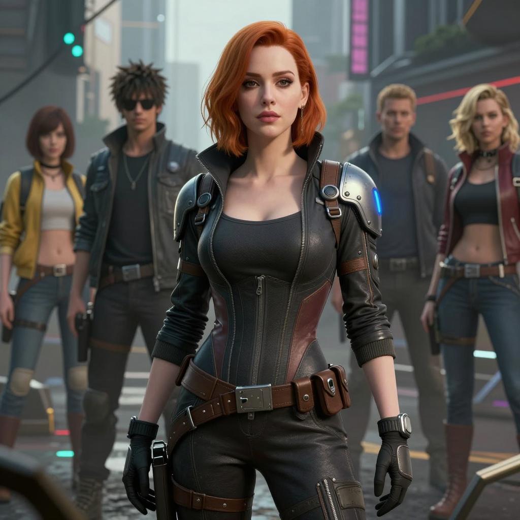Digital illustration featuring six serious and intense characters in a dark, rainy urban environment. Central figure is a man aiming a gun with a flashlight, surrounded by four other characters with expressive faces: a wet-haired blue-tinted man, a blonde woman, a dark-haired woman with neon light reflections, and a young woman with glasses and red face paint. The composition is moody with rain droplets and dramatic lighting.
