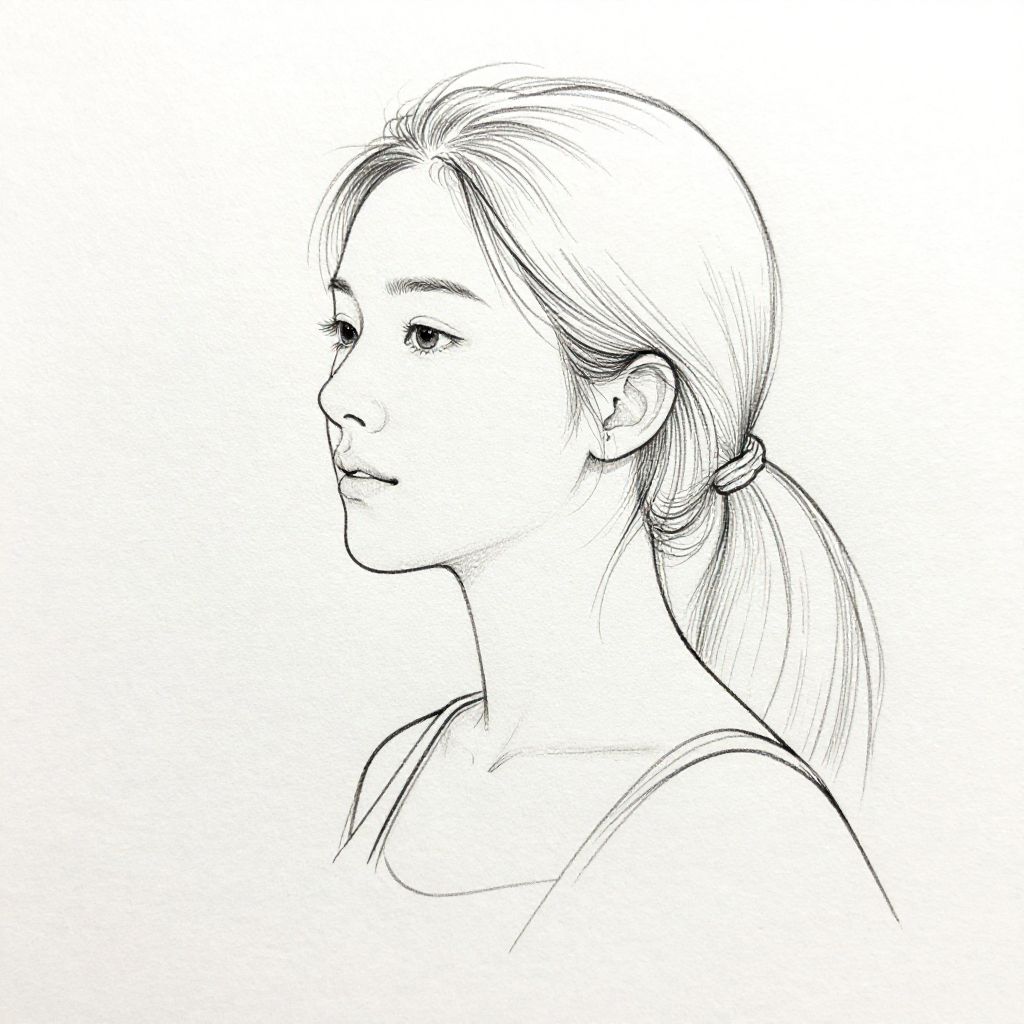 This is a black-and-white digital line drawing of a young woman in profile, facing left. She has long, straight hair tied in a low ponytail with a visible hairband. Her expression is neutral, with slightly parted lips and a calm gaze. She is wearing a simple, sleeveless top. The drawing uses fine, clean lines with minimal shading, emphasizing her facial features and hair texture. The background is entirely white, making the subject the focal point of the image. The style is minimalist and realistic, focusing on the natural beauty and simplicity of the subject.