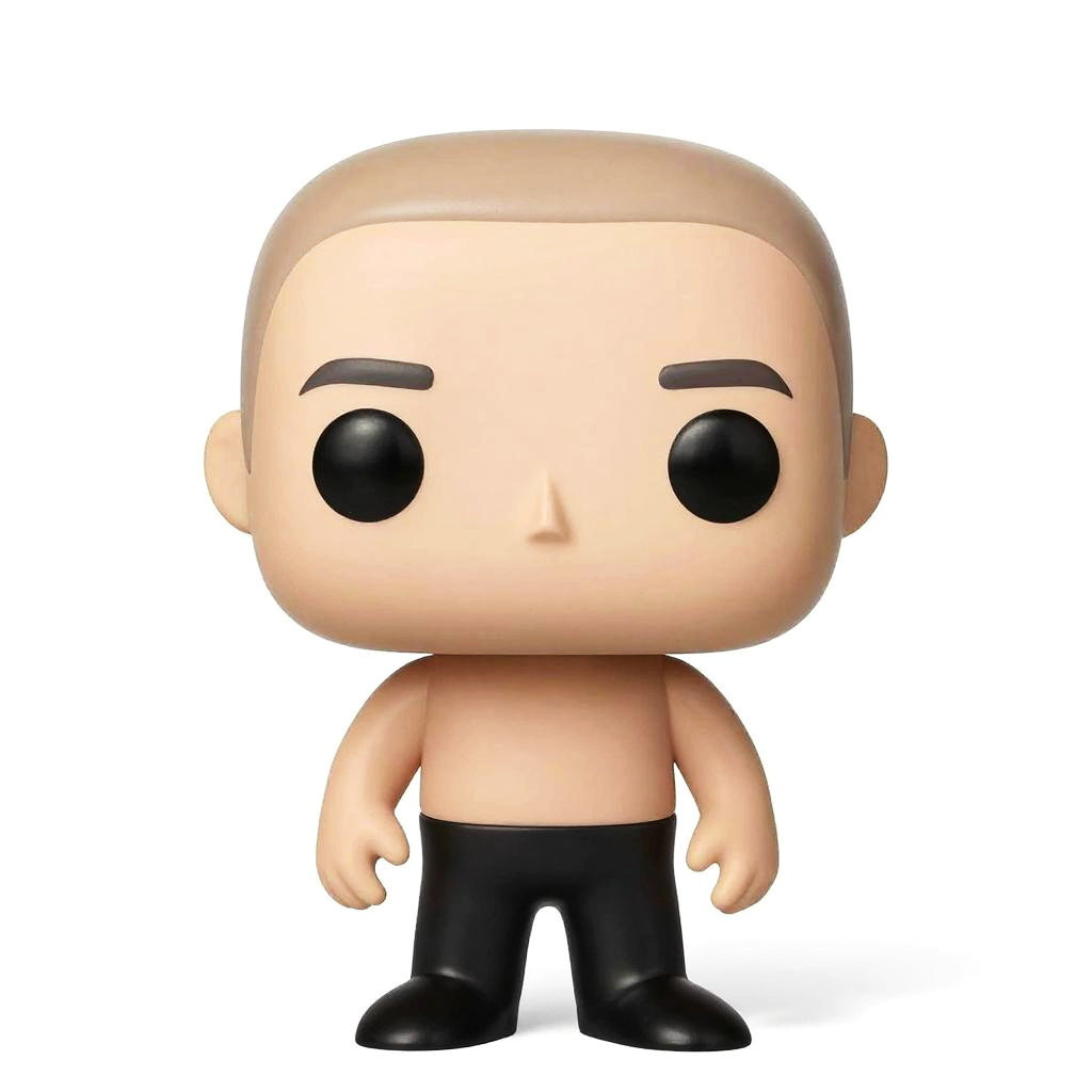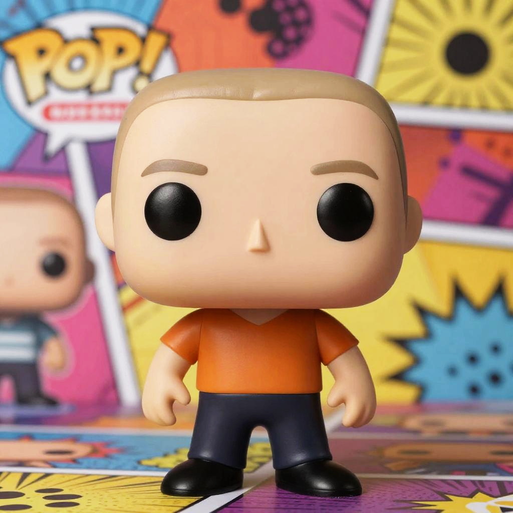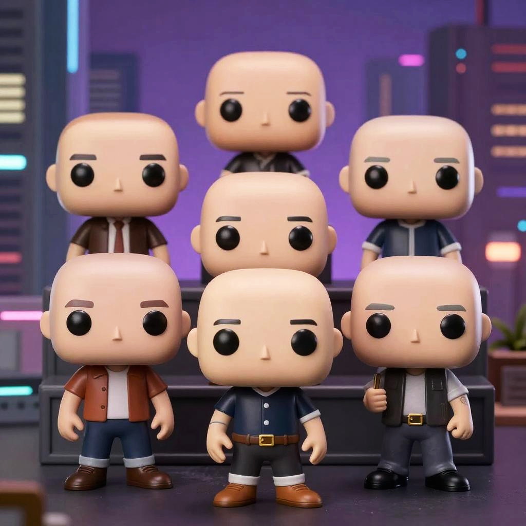 Bald Funko character with stylized clothing and accessories, sitting on a wooden shelf with other collectibles, warm lighting, realistic reflections, cozy atmosphere